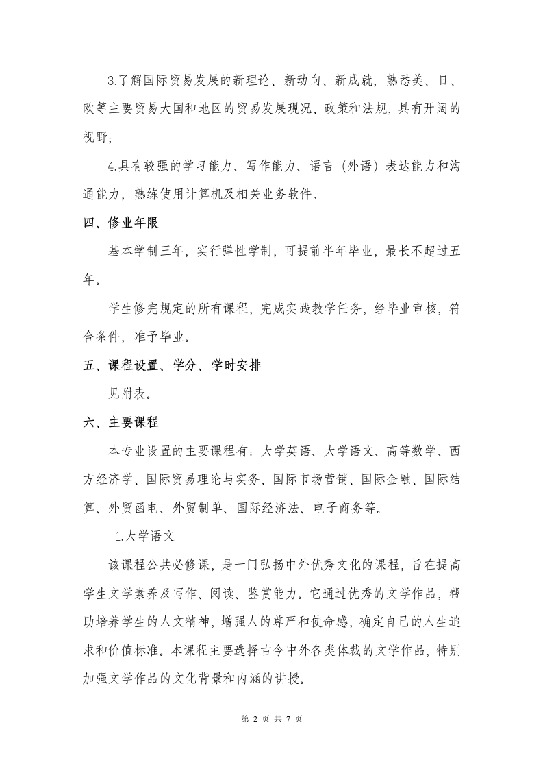 丽水学院国际经济与贸易专业(专升本函授)人才培养方案一、专业名称、层次专业名称:国际经济与贸易层次:专升本二、培养目标本专业培养系统掌握国际经济与贸易的基本理论与基本技能,熟悉国际贸易规则和惯例以及中国对外贸易的政策法规,具有国际经济与贸易职业基本能力、国际经济与贸易职业通用能力、国际经济与贸易实务操作能力,从事国际经济与贸易业务与管理工作的应用型、创业创新型专门人才。毕业生主要立足丽水,面向长三角及周边地区,能够胜任各类外贸型企业从事国际贸易业务、国际贸易单证、国际结算、国际货代等业务及管理工作。三、基本要求本专业学生主要学习国际经济与贸易专业的基本理论和基本知识,接受国际经济与贸易基本理论和实务操作的基本训练,具备优良的素质结构、能力结构和知识结构。毕业生应获得以下几个方面的知识和能力:1.掌握国际经济与贸易专业的基本理论和基本知识;2.掌握国际贸易过程中所需的报关、报检、货运代理等国际物流实务的操作能力;掌握国际贸易运作过程中所需的国际结算、国际金融、国际市场营销实务的操作能力;第1页共7页