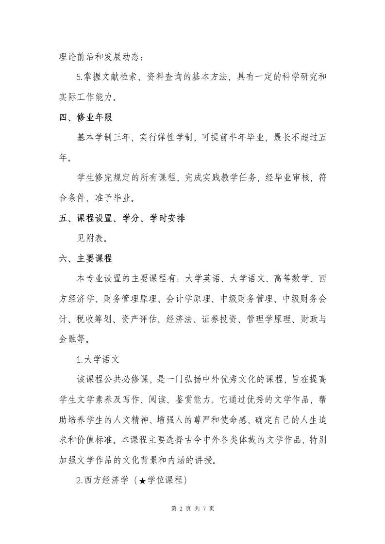 丽水学院财务管理专业(专升本函授)人才培养方案一、专业名称、层次专业名称:财务管理层次:专升本二、培养目标本专业以公司财务为重点,兼顾财务管理的其他领域,侧重于从微观视角研究企业财务管理、资本市场与证券投资、商业银行财务管理、非营利组织财务管理以及个人理财等方面的基本理论和方法,培养适应现代市场经济需要的、具有开阔视野和良好职业道德、熟悉财务、金融、会计等相关法规、掌握财务管理专业知识和实务操作技能,能够胜任各类企事业单位、中介组织、政府管理部门的投融资管理、财务分析、理财规划及资本运营的应用型人才。三、基本要求本专业学生主要学习财务管理专业的基本理论和基本知识,接受财务管理基本理论和实务操作的基本训练,具备优良的素质结构、能力结构和知识结构。毕业生应获得以下几个方面的知识和能力:1.掌握管理学、经济学和财务与金融的基本理论、基本知识;2.掌握财务、金融管理的定性、定量分析方法;3.具有较强的语言与文字表达、人际沟通、信息获得能力及分析和解决财务、金融管理实际问题的基本能力;4熟悉我国财务、金融管理的方针、政策和法规,了解本学科的第1页共7页