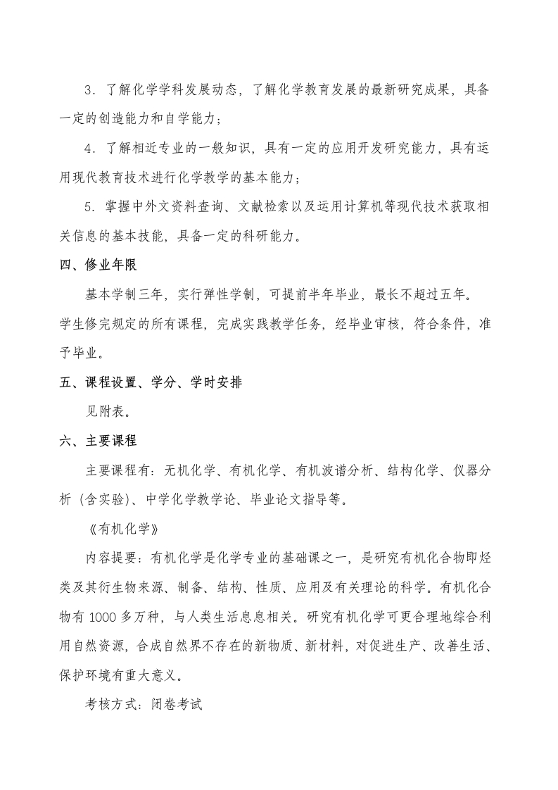 丽水学院化学专业(专升本函授)人才培养方案一、专业名称、层次专业名称:化学层次:专升本二、培养目标本专业是高等师范专科毕业的学员,系统的进修高等师范本科的课程,使学员在德、智、体、美等方面全面发展,成为合格的中学化学教师。三、基本要求热爱中国共产党、社会主义祖国和人民的教育事业,坚持四项基本原则,努力学习马列主义、毛泽东思想、邓小平理论和“三个代表”重要思想;树立正确的世界观、人生观和价值观,热爱劳动,遵纪守法,团结合作;具有良好的思想品德、社会公德和教师职业道德,为人师表,自觉地为社会主义现代化建设服务,为发展教育事业服务。本专业学生主要学习化学方面的基础知识、基本理论和基本技能与方法,受到科学思维和科学实验的训练,通过教育理论课程的学习和教学实践的锻炼,具有良好的从事化学教学和化学教学研究的能力。毕业生应获得以下几方面的知识和能力:1.掌握无机化学、分析化学(含仪器分析)、有机化学、物理化学(含结构化学)以及化学工程的基础知识、基本原理和基本实验技能:2.熟悉教育法规,掌握并能够初步运用教育学、心理学基础理论,具有良好的教师素养和从事化学教学的基本技能;