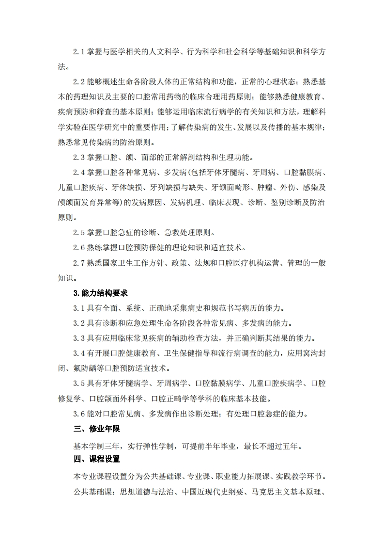 丽水学院口腔医学专业(专升本业余)人才培养方案一、专业基本信息专业名称:口腔医学专业代码:100301办学层次:专升本(业余)二、培养目标与人才规格(一)培养目标培养适应社会医疗卫生事业发展需要,具备基础医学、临床医学、口腔医学的基本理论和口腔疾病防治的基本技能,有口腔临床工作专业能力、继续口腔医学教育、继续职业发展和持续医疗实践再提高能力,能在基层医疗机构从事口腔科常见病和多发病诊、治、防工作的高素质应用型专业人才。(二)人才规格要求学生能够掌握本专业必需的基础理论、基本知识和基本技能,具有良好的思想品德和职业道德、职业素质,毕业后能达到以下知识、能力和素质目标要求:1.素质结构要求1.1树立正确的世界观、人生观和价值观,具有爱国主义、集体主义精神,愿为医疗卫生事业的发展和人类身心健康奋斗终身。1.2具有良好的职业道德及救死扶伤的人道主义精神,病人利益高于一切,始终以防病治病、维护患者的身心健康为己任。1.3具有较强人际交往能力,善于与病人、家属、同事等沟通。1.4尊重同事,相互学习,有团队合作精神。1.5树立终身学习观念,不断追求卓越,具备在口腔医学领域内进一步深造的扎实基础。1.6具有较强的创新意识、为新知识的产生、新技能的发现做出贡献。1.7树立成本效益观念,发挥可用卫生资源的最大效益。1.8具有实事求是的科学态度和严谨的工作作风。1.9树立依法行医的法律观念,自觉维护病人和自身的权益,尊重病人的隐私和人格。2.知识结构要求