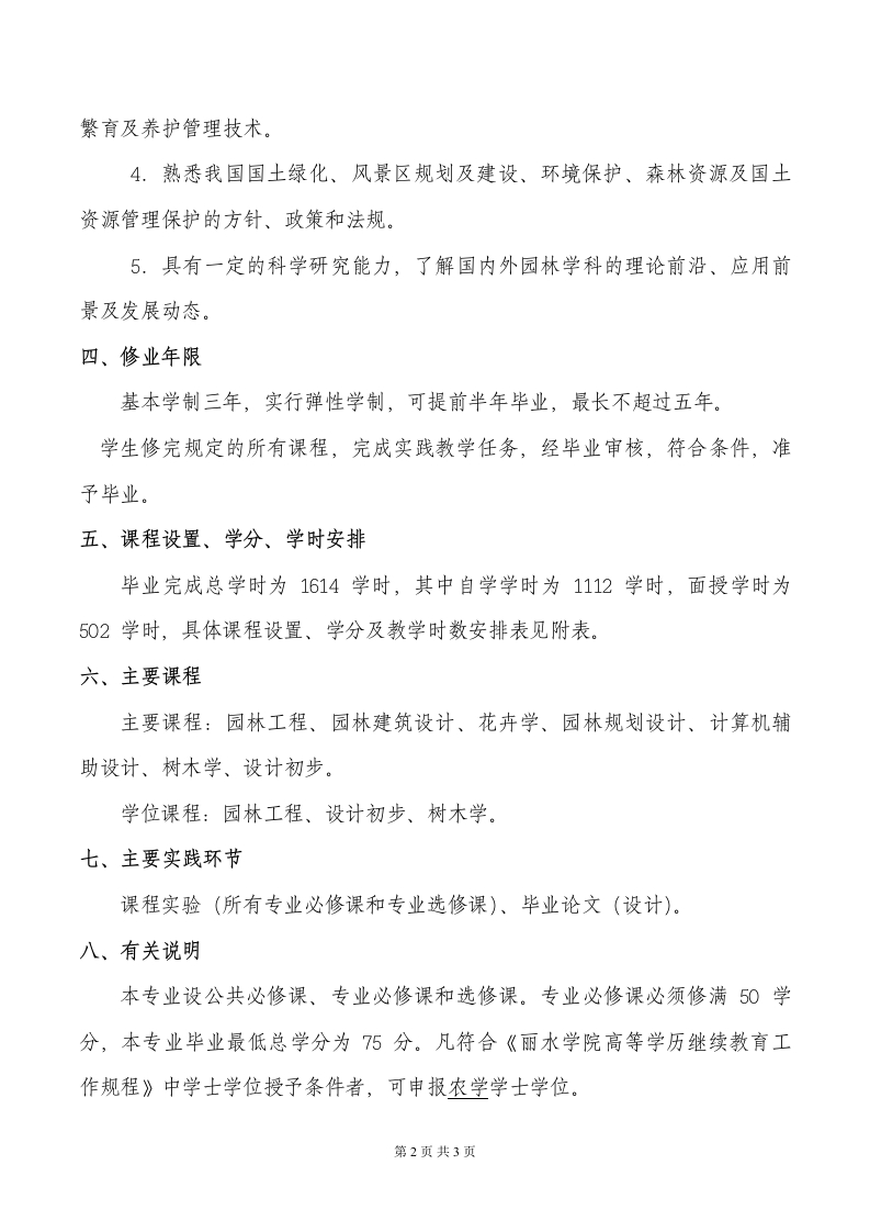 丽水学院园林专业(专升本函授)人才培养方案一、专业名称、层次专业名称:园林层次:专升本二、培养目标本专业培养具备生态学、园林植物与观赏园艺、风景园林规划设计等方面的知识,能在城市建设、园林、林业部门和花卉等企业从事风景区、森林公园、城镇各类园林绿地的规划、设计、施工、园林植物繁殖栽培、养护及管理的高级人才。三、基本要求本专业学生主要学习园林植物、园林规划设计、园林建筑、园林工程等方面的基本理论和基本知识,受到美术及表现技法、规划设计、园林植物栽培与繁育等方面的基本训练,具有城镇绿化、园林工程、园林建筑、园林植物栽培、繁育及养护管理等方面的基本能力。毕业生主要获得以下方面的知识和能力:1.要求学生有宽厚的基础知识,良好的思想品德、身体素质和人文素养。2.具备扎实的生物学、园林学、建筑学、设计艺术学学科的基本理论知识。3.掌握风景名胜区规划、森林公园规划、城市绿地系统规划、各类城市园林绿地规划设计方法;掌握园林绿化施工与管理技术;掌握园林植物栽培、第1页共3页