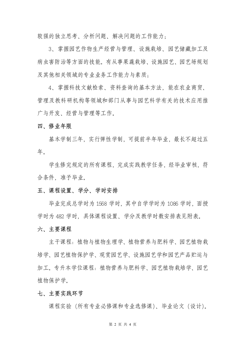 丽水学院园艺专业(专升本函授)人才培养方案一、专业名称、层次专业名称:园艺层次:专升本二、培养目标通过学习园艺学和生物学的基本理论与知识,形成扎实的园艺理论知识体系和较宽厚的园艺专业基本技能,能在园艺生产与管理部门、花卉生产和销售企业、农林事业单位、园艺产品检验检测部门从事现代园艺生产、技术开发与推广、经营与管理及教学与科研等工作,有较好适应能力和专业特长的专业技术人才。三、基本要求本专业学生要求学习植物与植物生理学、土壤与植物营养学等园艺基本专业知识,掌握园艺植物栽培学、园艺植物保护学和园艺产品贮运与加工等方面的知识理论和基本技能;通过课程实验等实践教学环节提升专业技能,具备园艺化生产管理、园艺病虫害防治、园艺产品贮藏与营运等方面的基本能力。具体包括以下几个方面的知识和能力:1.扎实的自然科学基础理论知识,在德、智、体、美等全面发展,具有良好的职业道德和社会素质能力。2.掌握园艺学和生物学的基本理论与基本知识,具备园艺产业生产管理;了解园艺产业发展前沿技术及产业发展趋势与地位,具备第1页共4页