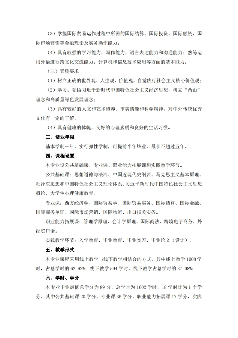 丽水学院国际经济与贸易专业(专升本函授)人才培养方案一、专业基本信息专业名称:国际经济与贸易专业代码:020401办学层次:专升本(函授)二、培养目标与人才规格培养目标:本专业以习近平新时代中国特色社会主义经济思想为指导,立足浙西南,面向长三角,牢固树立高质量绿色发展理念,培养践行社会主义核心价值观,具有良好思想品质和道德修养,系统掌握国际经济与贸易的基本理论与基本技能,熟悉国际贸易规则和惯例以及中国对外贸易的政策法规,认识与把握国内外经济、贸易的运行机制和发展规律,熟练使用1门外语,熟练运用现代信息技术,具有国际经济与贸易职业基本能力、通用能力和实务操作能力,从事国际经济与贸易业务与管理工作的应用型、复合型、创新型专业人才。毕业生能够立足浙江,面向长三角及周边地区,在大中型外贸企业从事国际贸易业务、国际贸易单证、国际贸易跟单、国际结算、国际货代等业务及管理工作,在毕业5年后,能成为大中型外贸企业的业务骨干:服务与助推国内、国际经济双循环。人才规格:本专业学生主要学习国际经济与贸易专业的基本理论和基本知识,接受国际经济与贸易专业实务操作的基本训练,具备优良的素质结构、能力结构和知识结构,掌握基础性知识、专业性知识、工具性知识和通识性知识。(一)知识要求(1)掌握国际经济与贸易专业的基本理论和基本知识:(2)熟悉国际经济与贸易的理论前沿和行业需求,了解国际贸易发展的新理论、新动向、新成就,具有一定的全球视野:(3)熟悉美、日、欧和“一带一路”沿线国家(地区)等主要贸易伙伴的贸易发展现况、政策和法规。(二)能力要求(1)掌握国际经济与贸易专业实务操作能力:(2)掌握国际货物运输过程中的报关、报检、货运代理等实务操作能力: