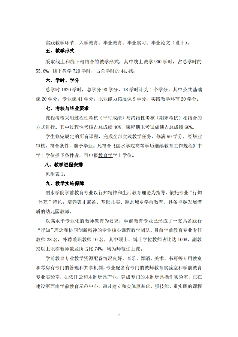 丽水学院学前教育专业(专升本函授)人才培养方案一、专业基本信息专业名称:学前教育专业代码:040106办学层次:专升本(函授)二、培养目标和人才规格1.培养目标本专业坚持立德树人为根本宗旨,立足丽水,面向浙江,培养具有良好思想道德品质,具备扎实的学前教育专业知识能力,能够适应现代学前教育改革与发展需要,胜任幼儿园保教相关工作的学前教育专业人才。2.人才规格(1)树立社会主义核心价值观,具有崇高的教师职业道德素养、较强的创造意识和创新能力,热爱学前教育事业,热爱儿童,乐于为学前教育事业发展贡献自己的才华。(2)系统掌握学前教育学、学前儿童发展科学等学前教育基础理论知识,熟悉儿童身心发展特点、教育政策法规和发展前沿,具备幼儿园保教需要的艺术素养、人文素养和科学素养,能独立开展幼儿园保育、教育活动和班级管理工作。(3)具有良好的人文社会科学和自然科学基本知识,熟悉学前教育事业改革与发展,具有初步的学前教育科学研究和工作实践创新能力。三、修业年限基本学制三年,实行弹性学制,可提前半年毕业,最长不超过五年。四、课程设置本专业课程设置分为公共基础课、专业课、职业能力拓展课、实践教学环节。公共基础课:思想道德与法治、中国近现代史纲要、马克思主义基本原理、毛泽东思想和中国特色社会主义理论体系、习近平新时代中国特色社会主义思想概论、大学生心理健康教育。专业课:学前教育学、学前儿童发展科学、学前比较教育学、学前儿童社会教育、学前儿童科学教育、学前儿童健康教育、幼儿行为观察与矫正、幼儿舞蹈创编、幼儿体育游戏与创编。职业能力拓展课:教师礼仪、教师口语、教育政策与法规、幼儿园课程。1