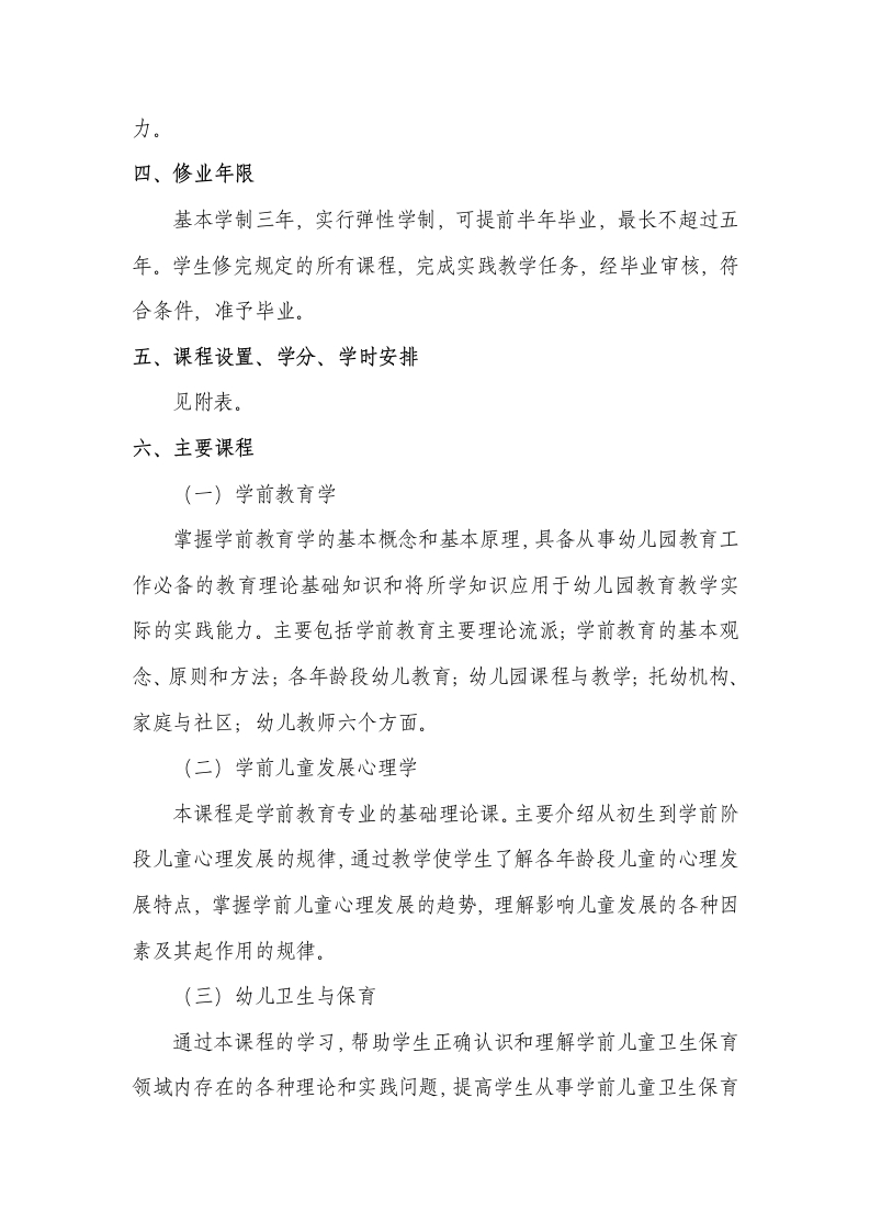 丽水学院学前教育专业(高起专函授)人才培养方案一、专业名称、层次专业名称:学前教育层次:高起专二、培养目标按照《教师教育课程标准》和《幼儿园教师专业标准》的要求,主要培养面向幼儿园、早教机构以及儿童事业的相关单位,培养具有科学的学前教育专业理念、良好的人文素质和职业道德素养,掌握一定的保教基本能力与教育科研、早期教育指导等拓展能力,以及可持续发展能力的学前教育专业人才。三、基本要求1.懂得马列主义、毛泽东思想和邓小平理论和新时代中国特色社会主义思想,具有爱国主义、集体主义、社会主义思想和良好的思想品德。2.具有良好的师德,热爱幼教事业,有爱心、耐心、细心,有吃苦耐劳的优良品质。3.具有从事幼儿教育和保育必备的基本技能;具有开展各种幼儿教育教学活动的组织指导技能和一定的幼儿园班级管理、园务管理技能;4.具有初步从事幼儿教育科学研究的技能,具有自觉创新、自主创业的精神,具有不断获取知识,开发自身潜能、可持续发展的能