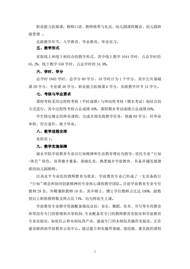 丽水学院学前教育专业(高起专函授)人才培养方案一、专业基本信息专业名称:学前教育专业代码:570102办学层次:高起专(函授)二、培养目标与人才规格1.培养目标本专业坚持立德树人为根本宗旨,立足丽水,面向浙江,培养具有科学的学前教育专业理念、良好的人文素质和职业道德素养,掌握一定的保教基本能力与教育科研、早期教育指导等拓展能力,以及可持续发展能力的学前教育专业人才。2.人才规格(1)坚持马列主义、毛泽东思想和邓小平理论和新时代中国特色社会主义思想,具有爱国主义、集体主义、社会主义思想和良好的思想品德:(2)具有良好的师德,热爱幼教事业,有爱心、耐心、细心,有吃苦耐劳的优良品质:(3)具有从事幼儿教育和保育必备的基本技能:具有开展各种幼儿教育教学活动的组织指导技能和一定的幼儿园班级管理、园务管理技能:(4)具有初步从事幼儿教育科学研究的技能,具有自觉创新、自主创业的精神,具有不断获取知识,开发自身潜能、可持续发展的能力。三、修业年限基本学制三年,实行弹性学制,可提前半年毕业,最长不超过五年。四、课程设置本专业课程设置分为公共基础课、专业课、职业能力拓展课、实践教学环节。公共基础课:思想道德与法治、中国近现代史纲要、马克思主义基本原理、毛泽东思想和中国特色社会主义理论体系、习近平新时代中国特色社会主义思想概论、大学生心理健康教育。专业课:教育政策与法规、中外学前教育简史、学前儿童社会教育、学前儿童科学教育、学前儿童语言教育、幼儿教育舞蹈技能、幼儿园教育环境创设、学前儿童游戏与创编、幼儿行为观察与指导、学前儿童发展心理学、学前教育学、学前儿童卫生与保育。