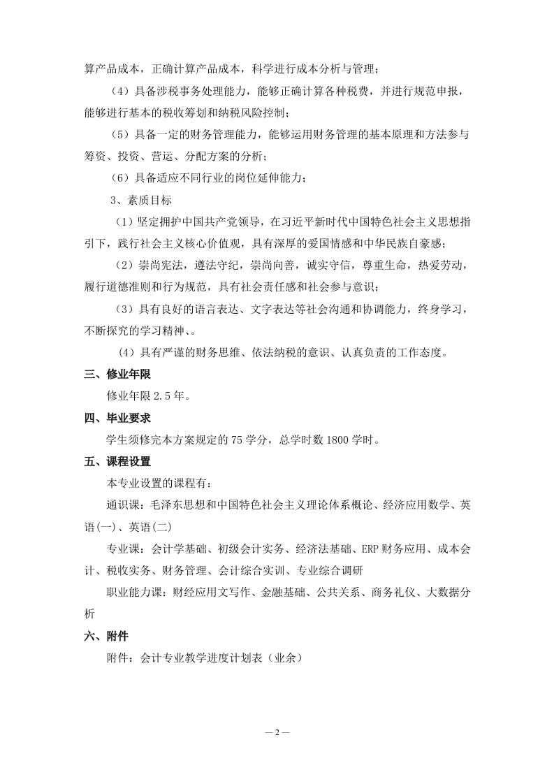 宁波职业技术学院成人高等教育2021级会计专业人才培养方案(业余,专科)一、职业面向本专业培养具备财务基础知识和基本理论,掌握会计基本技能,面向各类企业、中介机构和非营利组织从事财务核算、账务处理、管理决策、统计分析等会计工作的德智体美劳全面发展的高素质技术技能型人才。主要就业单位中小型工业企业、商业企业、服务中介机构主要就业部门财务管理部门、税务管理部门、仓库管理部门、采购部门主要从事岗位出纳岗位、会计岗位、成本、工资及资产核算岗位、报表编制岗位、税务岗位、数据录入岗位、数据审核岗位、数据分析岗位、档案管理岗位、仓库保管岗位二、培养目标培养学思想政治坚定、德技并修、全面发展,适应建设中国特色社会主义市场经济需要,具有一定的科学文化水平及良好的职业道德、工匠精神和创新精神,掌握扎实的专业知识、熟练的职业技能和良好的可持续发展能力的财务人才。知识目标:1、知识目标(1)掌握必备的思想政治理论、科学文化基础知识和中华优秀传统文化知识:(2)掌握经济、管理、金融、税收、经济法等基础知识:(3)掌握财务会计、成本核算与管理、财务管理、纳税实务等专业知识:(4)掌握计算机信息系统、财务大数据分析等基础知识:(5)了解与本专业相关的国家经济政策变化情况:2、能力目标(1)具有较强的会计职业判断和会计核算能力:(2)具备资金管理能力,能够熟练运用各种资金结算工具,完成资金收付结算:(3)具备成本核算与管理能力,能够合理选择产品成本计算方法,正确计