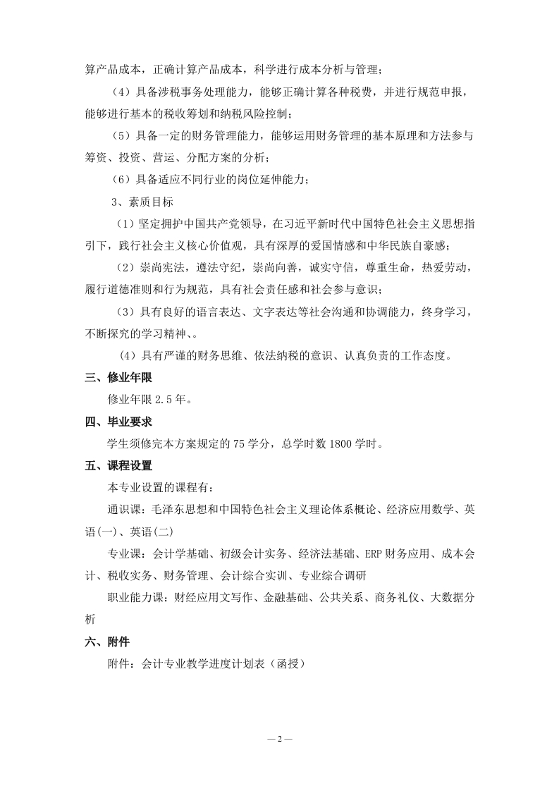 宁波职业技术学院成人高等教育2021级会计专业人才培养方案(函授,专科)一、职业面向本专业培养具备财务基础知识和基本理论,掌握会计基本技能,面向各类企业、中介机构和非营利组织从事财务核算、账务处理、管理决策、统计分析等会计工作的德智体美劳全面发展的高素质技术技能型人才。主要就业单位中小型工业企业、商业企业、服务中介机构主要就业部门财务管理部门、税务管理部门、仓库管理部门、采购部门主要从事岗位出纳岗位、会计岗位、成本、工资及资产核算岗位、报表编制岗位、税务岗位、数据录入岗位、数据审核岗位、数据分析岗位、档案管理岗位、仓库保管岗位二、培养目标培养学思想政治坚定、德技并修、全面发展,适应建设中国特色社会主义市场经济需要,具有一定的科学文化水平及良好的职业道德、工匠精神和创新精神,掌握扎实的专业知识、熟练的职业技能和良好的可持续发展能力的财务人才。知识目标:1、知识目标(1)掌握必备的思想政治理论、科学文化基础知识和中华优秀传统文化知识:(2)掌握经济、管理、金融、税收、经济法等基础知识:(3)掌握财务会计、成本核算与管理、财务管理、纳税实务等专业知识:(4)掌握计算机信息系统、财务大数据分析等基础知识:(5)了解与本专业相关的国家经济政策变化情况:2、能力目标(1)具有较强的会计职业判断和会计核算能力:(2)具备资金管理能力,能够熟练运用各种资金结算工具,完成资金收付结算:(3)具备成本核算与管理能力,能够合理选择产品成本计算方法,正确计
