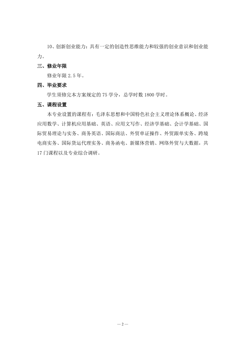 宁波职业技术学院成人高等教育2021级国际经济与贸易专业人才培养方案(函授,专科)一、培养目标本专业主要培养思想政治坚定,德智体劳全面发展,具有良好职业素养、创新意识和专业技能,适应区域经济和产业发展,从事外贸业务、外贸跟单、外贸单证、跨境电商、国际货代、涉外服务贸易等岗位的高素质高技能型人才。二、培养要求国际经济与贸易专业主要学习国际贸易基础理论知识,同时开展进出口业务、跨境电商、国际货代、报关报检、会展策划、国际营销等项目的教学实践,培养从事外贸进出口、跨境电商、国际船货代、国际商务代理等岗位群的高素质技术技能型人才、高水平外贸精英人才、创业创新型国际贸易人才。毕业生应获得以下几个方面的知识和能力:1、语言文化知识:具有较扎实的语言基础知识和中西方文化背景知识。2、商务专业知识:具有从事国际商务所必须的基础知识和业务操作常识。3、工具性知识:具有计算机、网络等信息技术应用知识和文献检索知识。4、创新创业知识:具有对创新创业背景知识的了解和相关行业的基础知识。5、语言交际能力:具有较强的跨文化交际能力,能流利地、正确使用两种语言开展国际商务活动。6、知识获取能力:具有较强的自主学习能力和较强的观察、分析判断及信息处理能力。7、知识应用能力:具有良好的综合运用语言及商务知识解决实际问题的能力,以及管理和组织协调能力。8、商务社交能力:具有在商务场合中较强的人际沟通能力和协调能力。9、平台应用和操作能力:具有专业外贸平台、跨境电商平台的操作和运营能力。