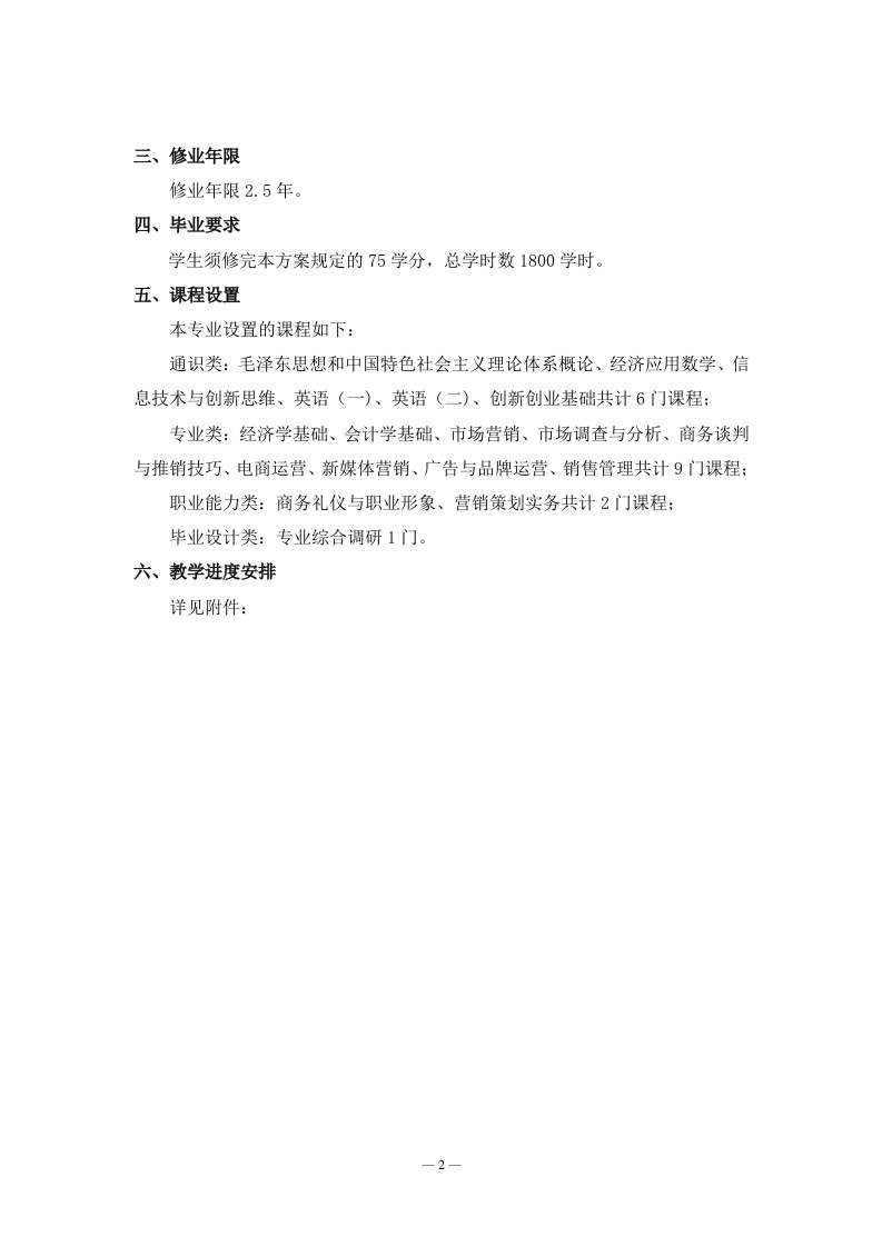 宁波职业技术学院成人高等教育2021级市场营销专业人才培养方案(函授,专科)一、培养目标本专业培养适应社会主义市场经济和社会发展需要,德智体全面发展,具有良好的职业道德和创新精神,具备互联网营销和新媒体营销思维,掌握现代市场营销专业知识和技能,具有市场调查与分析、谈判与推销、全渠道营销、营销策划、客户服务等工作能力,能在各类企事业单位从事市场营销业务和营销管理工作的应用型人才。二、培养规格本专业要求学生主要学习市场营销及管理方面的系统理论和专业知识,接受营销各项专业技能方面的系统训练,具有分析和解决营销管理问题的专业能力和创新能力。毕业生应具备以下方面的知识、能力和素质:1.知识目标:掌握毛泽东思想和中国特色社会主义理论体系概论、经济数学基础、现代信息技术、实用英语、创新创业教育等公共基础知识:;掌握本专业培养目标所要求的必备的经济、管理和财务的基本知识:掌握市场分析、商务谈判、产品销售、营销策划、网络营销、新媒体营销、客户维护、公共关系实务等市场营销专业知识。2.能力目标:具备一定的沟通表达能力、商务数据分析能力、产品销售能力、网络营销能力、新媒体运营能力、客户开发能力、营销策划能力、销售管理能力、创新创业能力等。3.素质目标:培养具有社会主义核心价值观和科学的世界观、人生观和价值观,热爱祖国、忠于人民的营销人才:培养传承“诚信、务实、开拓、创新的甬商精神,具有创新、创业思维的营销人才;培养具有吃苦耐劳的品质,坚忍不拔、乐观豁达的营销人才:培养具有较强的团队协作精神,良好的社会交往能力和人际沟通能力的营销人才。