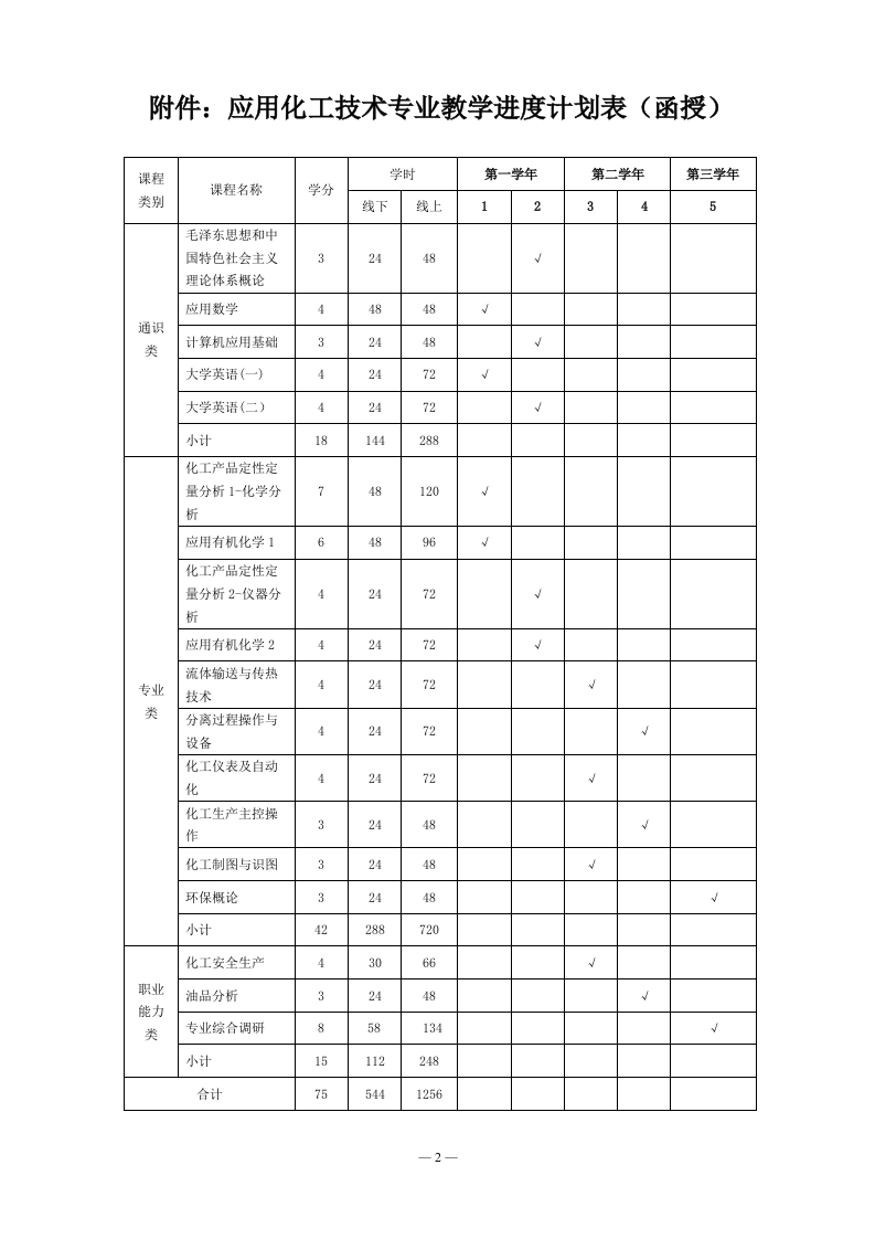 宁波职业技术学院成人高等教育2021级应用化工技术专业人才培养方案(函授,专科)一、培养目标本专业培养掌握化工生产技术方面必需的专业知识,主要面向石油化工、高分子化工、精细化工等企业第一线,从事生产操作及管理、分析化验等工作,具有良好职业道德、较强的专业技能和可持续发展的学习与适应能力的高素质技术技能型人才。二、培养要求1.能识读、绘制工艺流程简图和带控制点的工艺流程图。2.能识读、绘制主要设备的结构简图。3.能识记操作规程和工艺技术规程4.能检查装置管路、阀门、现场仪表、安全附件是否正常:能检查记录报表、用品、防护器材是否齐全。能完成装置试压、查漏、气密性试验、置换工作。5.能进行管路的拆装、机泵的开关、设备的检查工作。6.能够进行原料、辅料、公用工程等物料的准备工作。7.能进行自控仪表、计算机控制系统的台面操作。8.能按操作规程进行开车操三、修业年限修业年限2.5年。四、毕业要求学生须修完本方案规定的75学分,总学时数1800学时。五、课程设置本专业设置的课程有:毛泽东思想和中国特色社会主义理论体系概论、应用数学、计算机应用基础、英语(一)、英语(二)、化工产品定性定量分析1-化学分析、应用有机化学1、化工产品定性定量分析2-仪器分析、应用有机化学2、流体输送与传热技术、分离过程操作与设备、化工仪表及自动化、化工生产主控操作、化工制图与识图、环保概论、化工安全生产、油品分析共17门课程以及专业综合调研。