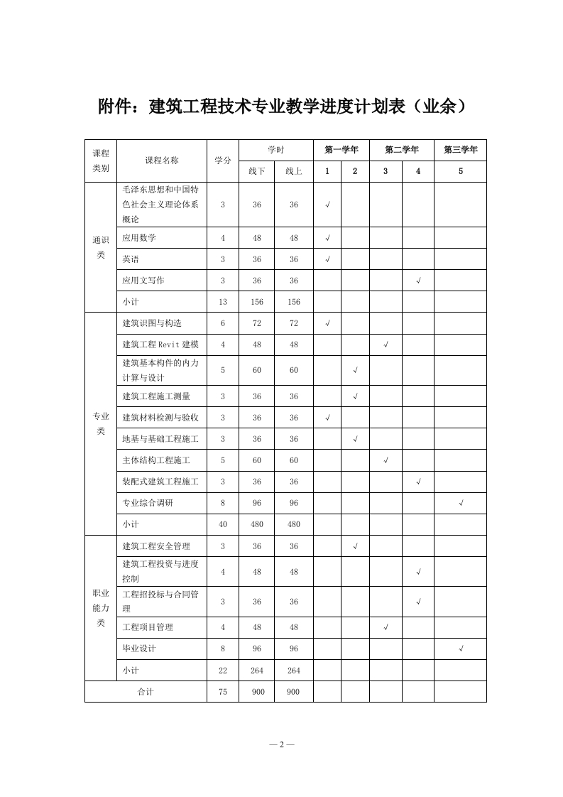 宁波职业技术学院成人高等教育2021级建筑工程技术专业人才培养方案(业余,专科)一、培养目标本专业培养掌握建筑工程施工管理所需专业知识和技能,主要面向建筑施工承包等企业生产一线,从事各类专业技术管理工作,具有较强专业技能与沟通能力,拥有良好的职业道德、创新及可持续发展能力的高素质技术技能型人才。二、培养要求具备基本的科学文化素养,掌握必需的人文科学基础知识:能够识读建筑工程施工图并绘制工程施工图样:熟练掌握施工工艺,能够对建筑工程的质量、进度、成本、安全等进行控制:能够对结构基本构件进行内力分析和计算,并完成基本构件的结构设计工作:能够阅读和编制施工方案及施工组织设计,完成施工技术交底工作:能够分析和编制建设工程招投标文件:能够使用各类建筑信息模型(BIM)软件,创建、应用与管理适用于建设工程施工所需的三维数字模型:能够完成预制装配式钢筋混凝土结构构件的生产、安装等技术管理工作:能解决本专业一般技术问题,具有指导施工并进行管理的能力三、修业年限修业年限2.5年。四、毕业要求学生须修完本方案规定的75学分,总学时数1800学时。五、课程设置本专业设置的课程有:毛泽东思想和中国特色社会主义理论体系概论、应用数学、英语、应用文写作、建筑识图与构造、建筑工程R©vit建模、建筑基本构件的内力计算与设计、建筑工程施工测量、建筑材料检测与验收、地基与基础工程施工、主体结构工程施工、装配式建筑工程施工、专业综合调研、建筑工程安全管理、建筑工程投资与进度控制、工程招投标与合同管理、工程项目管理、毕业论文等18门课程。