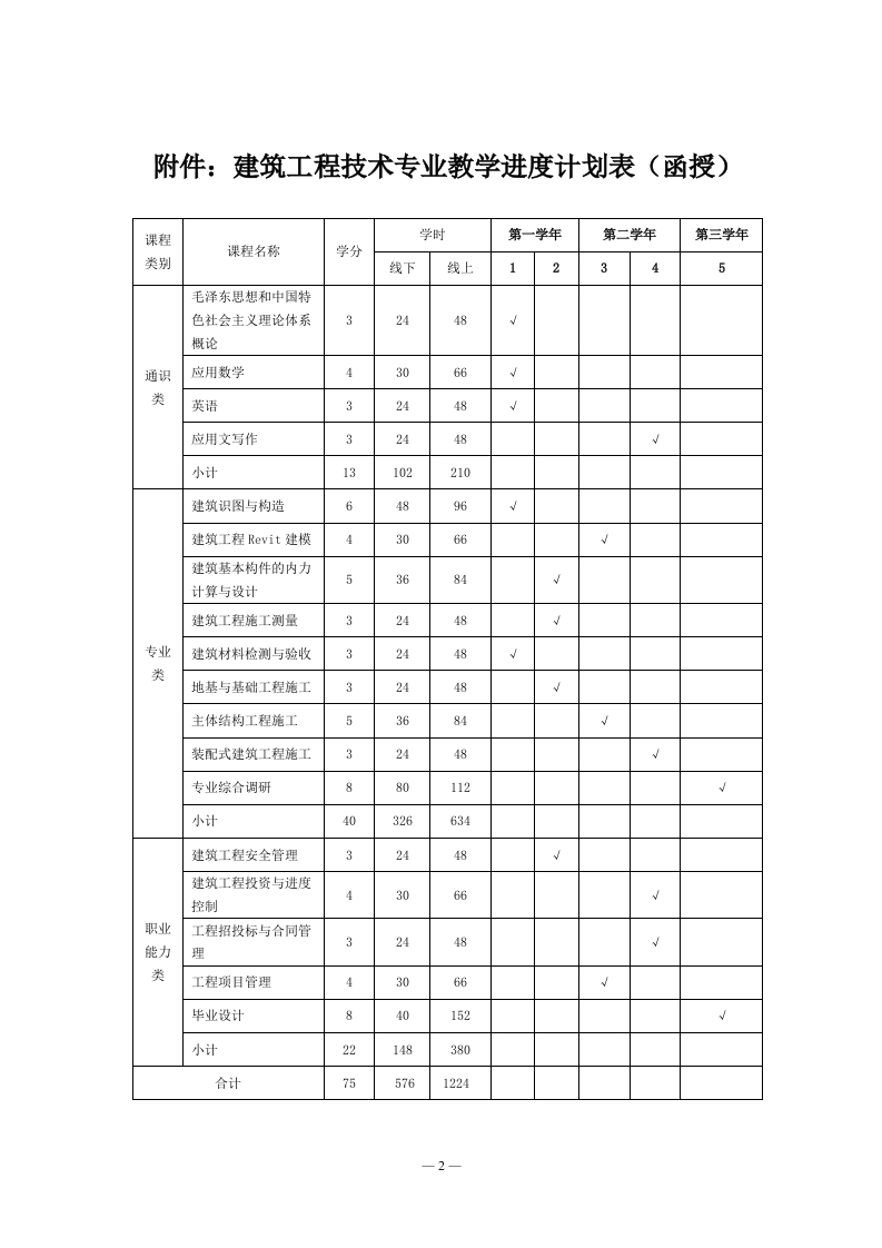 宁波职业技术学院成人高等教育2021级建筑工程技术专业人才培养方案(函授,专科)一、培养目标本专业培养掌握建筑工程施工管理所需专业知识和技能,主要面向建筑施工承包等企业生产一线,从事各类专业技术管理工作,具有较强专业技能与沟通能力,拥有良好的职业道德、创新及可持续发展能力的高素质技术技能型人才。二、培养要求具备基本的科学文化素养,掌握必需的人文科学基础知识:能够识读建筑工程施工图并绘制工程施工图样:熟练掌握施工工艺,能够对建筑工程的质量、进度、成本、安全等进行控制:能够对结构基本构件进行内力分析和计算,并完成基本构件的结构设计工作:能够阅读和编制施工方案及施工组织设计,完成施工技术交底工作:能够分析和编制建设工程招投标文件:能够使用各类建筑信息模型(BIM)软件,创建、应用与管理适用于建设工程施工所需的三维数字模型:能够完成预制装配式钢筋混凝土结构构件的生产、安装等技术管理工作:能解决本专业一般技术问题,具有指导施工并进行管理的能力三、修业年限修业年限2.5年。四、毕业要求学生须修完本方案规定的75学分,总学时数1800学时。五、课程设置本专业设置的课程有:毛泽东思想和中国特色社会主义理论体系概论、应用数学、英语、应用文写作、建筑识图与构造、建筑工程R©vit建模、建筑基本构件的内力计算与设计、建筑工程施工测量、建筑材料检测与验收、地基与基础工程施工、主体结构工程施工、装配式建筑工程施工、专业综合调研、建筑工程安全管理、建筑工程投资与进度控制、工程招投标与合同管理、工程项目管理、毕业论文等18门课程。