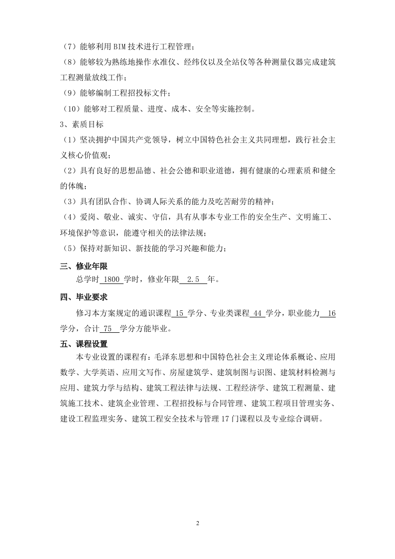 宁波职业技术学院成人高等教育2021级建设工程管理专业人才培养方案(函授,专科)一、培养目标本专业培养思想政治坚定、德技并修,适应房屋建筑工程生产需要,具有良好的职业素质,掌握建设工程管理专业领域中级技术与基层管理工作必备的知识与技能,面向一线建筑施工企业、工程咨询企业的施工及管理岗位的高素质技术技能型人才。二、培养规格1、知识目标(1)具备基本的科学文化素养,掌握必需的人文科学基础知识:(2)掌握Auto CAD软件绘制工程图样的规范依据和绘制方法:(3)熟悉建筑工程相关法律、法规的相关规定:(4)了解房屋建筑结构基本构造:(5)掌握建筑工程项目管理的基本方法:(6)掌握建筑工程质量、进度、成本、安全管理与控制的方法::(7)了解相关施工测量仪器的工作原理及使用方法:(8)掌握房屋建筑工程施工原理及方法:(9)掌握建筑工程监理实施的规范规定及方法:(10)掌握建筑工程招投标文件编制的依据和方法:(11)熟悉BIM软件在工程管理中的运用方法:2、能力目标(1)能够利用Auto CAD软件绘制简单的工程图样:(2)能够识读建筑工程建筑、结构及安装等专业施工图:(3)能够完成预制装配式钢筋混凝土结构构件的生产、安装等技术管理工作;(4)能够对进场的建筑材料及构配件等进行质量验收:(5)能够正确使用仪器、设备或工具对工程检验批、分项工程、分部工程、单位工程进行质量检查,并完成工程验收:(6)能够完成施工现场组织与管理工作,解决一般技术问题: