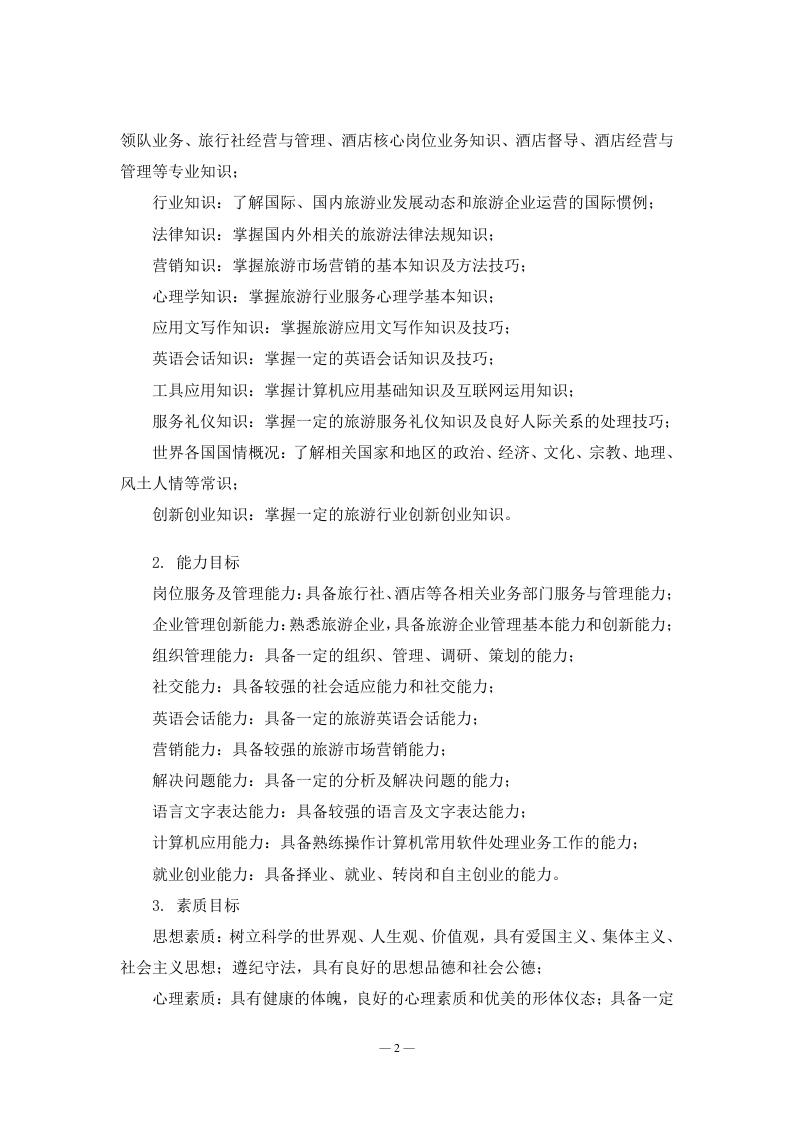 宁波职业技术学院成人高等教育2021级旅游管理专业人才培养方案(函授,专科)一、专业名称及代码【专业名称】旅游管理专业代码:640101三、修业年限和总学时数【修业年限】2.5年【总学时数】1800学时三、职业面向主要面向国内、国际旅行社,本土、涉外酒店集团等旅游企业,从事旅行社导游、领队、计调、销售以及酒店企业前厅、餐饮、客房、营销等核心岗位工作。毕业后经过1-3年时间的磨练,可胜任旅行社核心岗位管理层、酒店督导、门店店长及部门经理等旅游企业管理工作。四、毕业要求修习本方案规定公共基础课19学分与专业课56学分,合计75学分方能毕业。五、培养目标与规格(一)培养目标培养思想政治坚定、德智体美劳全面发展,适应文化与旅游产业发展需要,具有良好职业素养、较强专业技能及创新创业能力,掌握旅行社、酒店等旅游企业主要岗位工作流程及操作规范,面向国内、国际旅行社,本土、涉外酒店集团从事旅行社导游、领队、计调、销售以及酒店企业前厅、餐饮、客房、营销等核心岗位及酒店督导、门店店长等工作领域的高素质技术技能人才。(二)培养规格1.知识目标现代管理及专业知识:掌握现代管理理论知识以及导游业务、旅游政策法规、