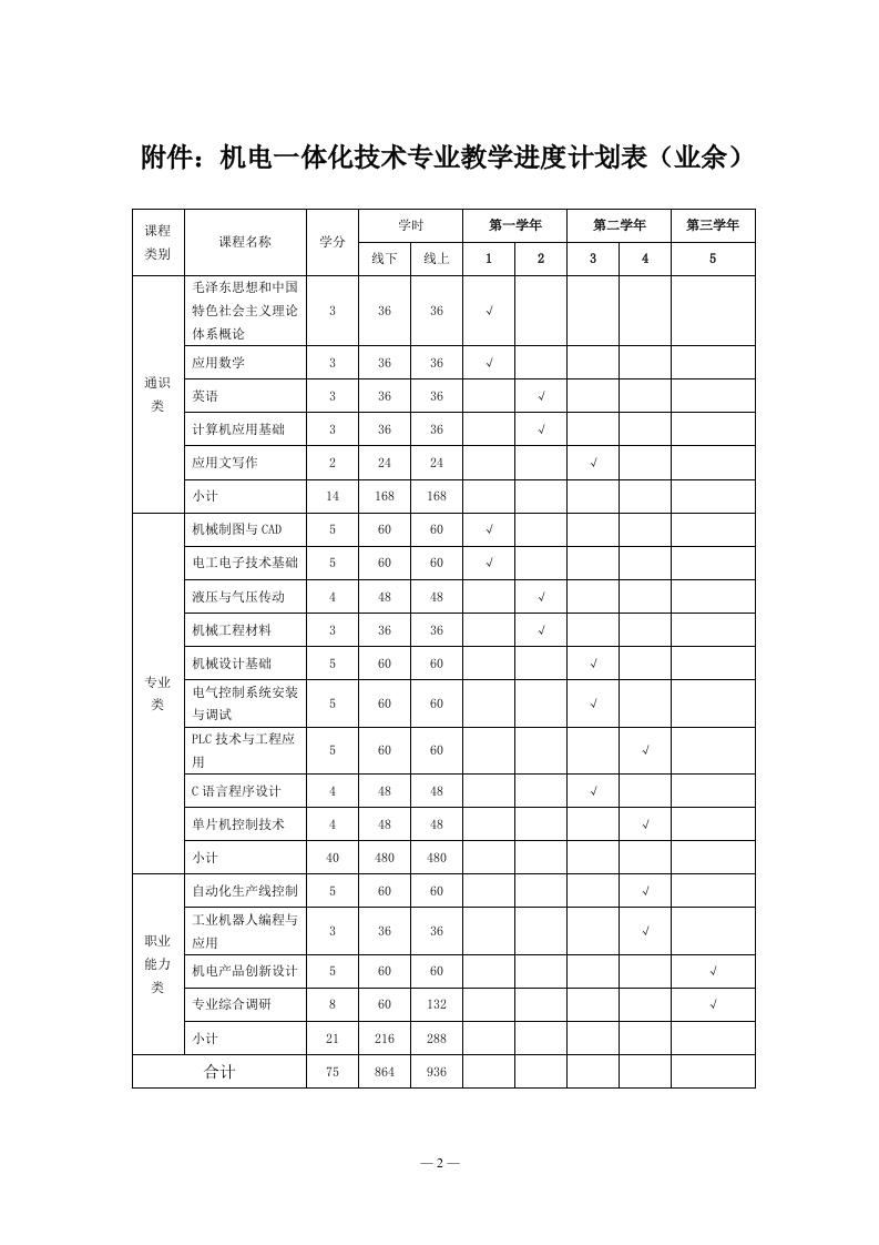 宁波职业技术学院成人高等教育2021级机电一体化技术专业人才培养方案(业余,专科)一、培养目标本专业培养适应社会主义市场经济和社会发展需要,德智体全面发展,具有良好的职业素质和文化修养,具有机械、电子、计算机基础知识及基本应用能力,能承担各类企事业单位的机电设备、自动化设备和生产线的运行、维护与管理的应用型人才。二、培养要求本专业学生主要学习机电一体化相关的基本理论、基本知识和基本技能,包括机械工程,电子工程,计算机等方面的专业课程,接受机电一体化方面的实习和实践等训练,并具有运用所学的理论和方法分析和解决实际问题的能力。毕业生应获得以下几方面的知识和能力:1、具备包括政治素质、职业道德、工程计算、外语应用和计算机技术应用能力在内的基本素质与能力。2、掌握机械制图、电子电工技术、传感检测技术、C语言程序设计等专业基础理论知识。3、掌握机械设计、电气控制系统安装与调试、PLC技术、单片机控制等专业理论知识。4、了解工业机器人编程与应用、工控物联技术及本专业领域的新技术。三、修业年限修业年限2.5年。四、毕业要求学生须修完本方案规定的75学分,总学时数1800学时。五、课程设置本专业设置的课程有:毛泽东思想和中国特色社会主义理论体系概论、应用数学、英语、计算机应用基础、应用文写作、机械制图与CAD、电工电子技术基础、液压与气压传动、机械工程材料、机械设计基础、电气控制系统安装与调试、PLC技术与工程应用、C语言程序设计、单片机控制技术、自动化生产线控制、工业机器人编程与应用、机电产品创新设计共17门课程以及专业综合调研。