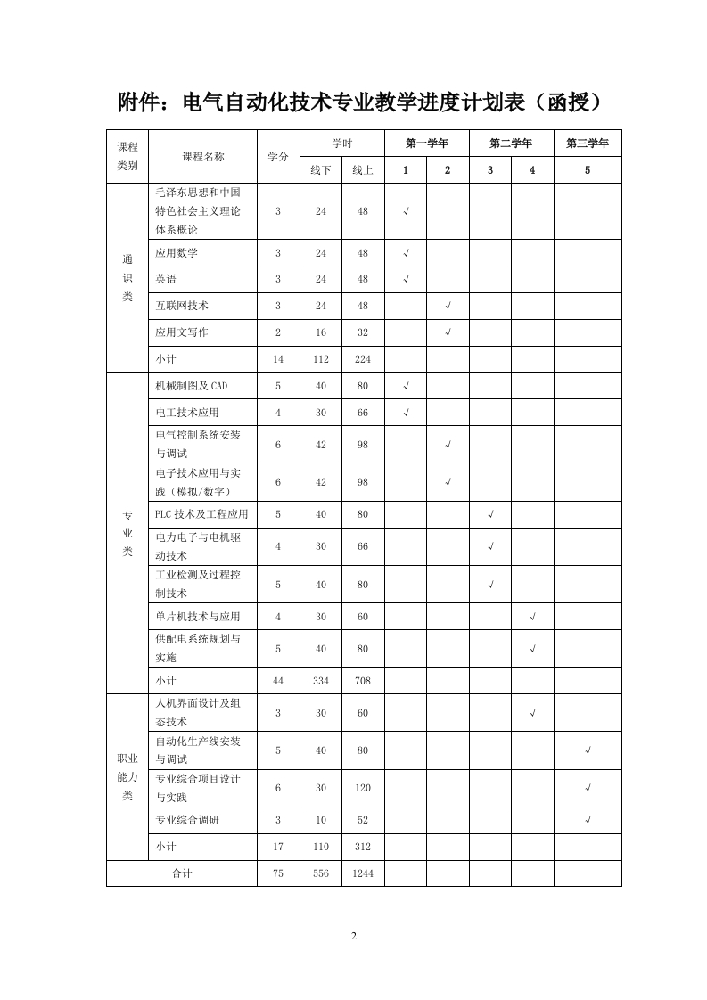 宁波职业技术学院成人高等教育2021级电气自动化技术专业人才培养方案(函授,专科)一、培养目标本专业主要培养掌握电气自动化技术方面的专业知识及专业技能,从事电气设备安装、维护、维修及设计,自动化仪表的维护、调试、操作等工作需要的实践能力强、具有良好职业道德的高素质技术技能型人才。二、培养要求本专业培养能掌握安装和调整电机及电气控制元件,对常规电控设备进行正常调试、维护,并填写相应记录,对常用传动系统安装,及其基本参数设置和修改。能识读复杂的控制系统图,PLC控制系统设计、调试、故障诊断和排除,自动化设备的维护和保养等能力。三、修业年限修业年限2.5年。四、毕业要求学生须修完本方案规定的75学分,总学时数1800学时。五、课程设置本专业设置的课程有:毛泽东思想和中国特色社会主义理论体系概论、应用数学、英语、互联网技术、应用文写作、机械制图及CD、电工技术应用、电气控制系统安装与调试、电子技术应用与实践(模拟/数字)、PLC技术及工程应用、电力电子与电机驱动技术、工业检测及过程控制技术、单片机技术与应用、供配电系统规划与实施、人机界面设计及组态技术、自动化生产线安装与调试、专业综合项目设计与实践、专业综合调研共18门课程。