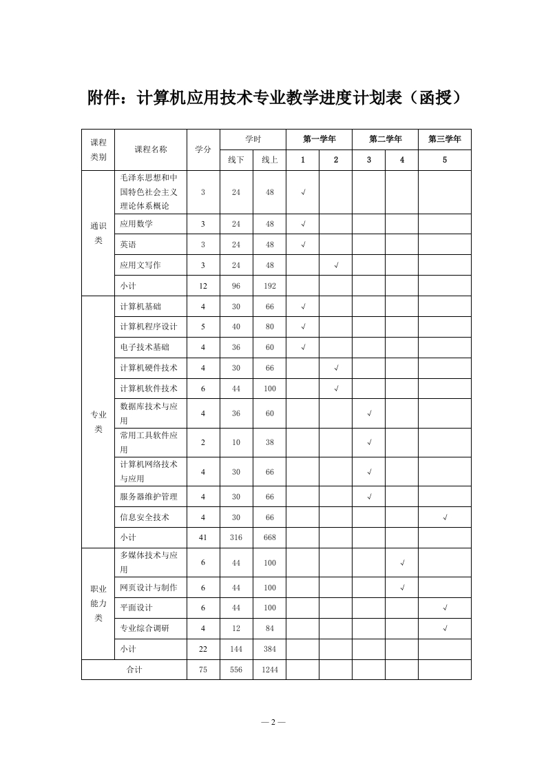 宁波职业技术学院成人高等教育2021级计算机应用技术专业人才培养方案(函授,专科)一、培养目标本专业培养适应社会主义市场经济和社会发展需要,德智体美劳全面发展,具有良好的职业素质和文化修养,在T领域从事计算机专业技术工作的高等技术应用性人才。要求学生通过三年函授学习,较系统地掌握本专业的基础理论、基本知识和技能,具有从事本专业和相邻专业实际工作和研究工作的能力及素质。二、培养要求掌握操作系统Windows的使用,理解计算机系统组成,理解数据库技术及数据库应用开发的一般步骤,掌握设计软件的使用,理解计算机网络基本原理及交换机,能够识别计算机配件,并组装和维护计算机硬件系统,能够安装使用Windows系列等操作系统,能够组建中小企业网络,并对网络进行日常管理和维护,能够安装和使用常用工具软件,进行基本的平面设计,会软件升级,完成日常工作,能够运用数据库技术管理办公数据,掌握信息安全技术、病毒防范。三、修业年限修业年限2.5年。四、毕业要求学生须修完本方案规定的75学分,总学时数1800学时。五、课程设置本专业设置的课程有:毛泽东思想和中国特色社会主义理论体系概论、应用数学、英语、应用文写作、计算机基础、计算机程序设计、电子技术基础、计算机硬件技术、计算机软件技术、数据库技术与应用、常用工具软件应用、计算机网络技术与应用、服务器维护管理、信息安全技术、多媒体技术与应用、网页设计与制作、平面设计等17门课程以及专业综合调研。