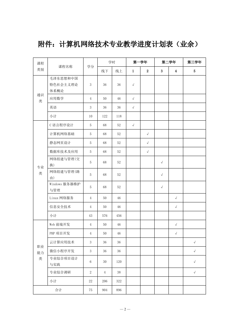 宁波职业技术学院成人高等教育2021级计算机网络技术专业人才培养方案(业余,专科)一、培养目标本专业培养掌握计算机网络系统规划与组建,网络运行维护与管理安全、网站建设服务、网络应用开发等技术,主要面向各类T企业从事网络工程师、网页设计师的工作,具有良好职业道德、熟练专业技能和可持续学习与适应能力的高素质技术技能型人才。二、培养要求本专业是培养适应生产、建设、管理、服务第一线需要的德、智、体、美、劳全面发展,掌握计算机网络技术基础知识,具备网络系统设计、实施、运维能力的高级技术应用型专门人才。学生在校期间掌握网络的相关理论知识,具有从事计算机网络集成、网络设备配置、网络管理和安全维护,以及基于Wb的软件开发等方面的能力。在熟悉和掌握专业知识后可从事计算机系统维护、网络管理、网络设备调试、网站建设、w©b应用等工作。面向岗位包括网络构架工程师、网络集成工程师、网络安全工程师、网页设计师、web全栈工程师等。三、修业年限修业年限2.5年。四、毕业要求学生须修完本方案规定的75学分,总学时数1800学时。五、课程设置本专业设置的课程有:毛泽东思想和中国特色社会主义理论体系概论、应用数学、英语、C语言程序设计、计算机网络基础、静态网页设计、数据库技术及应用、网络组建与管理(交换)、网络组建与管理(路由)、Windows服务器维护与管理、Linux网络服务、信息安全技术、Wb前端开发、PHP项目开发、云计算应用技术、微信小程序开发、专业综合项目设计与实践、专业综合调研等18门课程。
