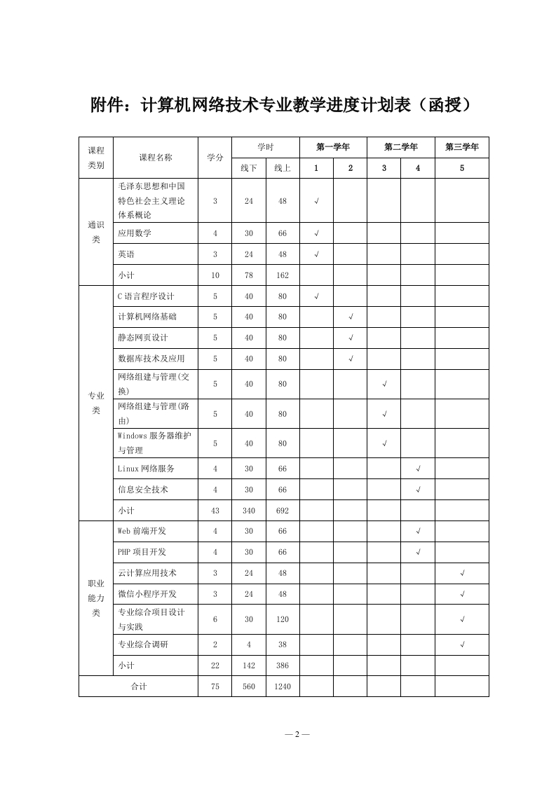 宁波职业技术学院成人高等教育2021级计算机网络技术专业人才培养方案(函授,专科)一、培养目标本专业培养掌握计算机网络系统规划与组建,网络运行维护与管理安全、网站建设服务、网络应用开发等技术,主要面向各类T企业从事网络工程师、网页设计师的工作,具有良好职业道德、熟练专业技能和可持续学习与适应能力的高素质技术技能型人才。二、培养要求本专业是培养适应生产、建设、管理、服务第一线需要的德、智、体、美、劳全面发展,掌握计算机网络技术基础知识,具备网络系统设计、实施、运维能力的高级技术应用型专门人才。学生在校期间掌握网络的相关理论知识,具有从事计算机网络集成、网络设备配置、网络管理和安全维护,以及基于Wb的软件开发等方面的能力。在熟悉和掌握专业知识后可从事计算机系统维护、网络管理、网络设备调试、网站建设、w©b应用等工作。面向岗位包括网络构架工程师、网络集成工程师、网络安全工程师、网页设计师、web全栈工程师等。三、修业年限修业年限2.5年。四、毕业要求学生须修完本方案规定的75学分,总学时数1800学时。五、课程设置本专业设置的课程有:毛泽东思想和中国特色社会主义理论体系概论、应用数学、英语、C语言程序设计、计算机网络基础、静态网页设计、数据库技术及应用、网络组建与管理(交换)、网络组建与管理(路由)、Windows服务器维护与管理、Linux网络服务、信息安全技术、Wb前端开发、PHP项目开发、云计算应用技术、微信小程序开发、专业综合项目设计与实践、专业综合调研等18门课程。