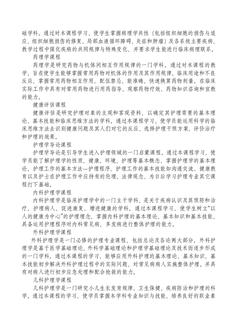 丽水学院护理专业(高起专函授)人才培养方案一、专业名称、层次专业名称:护理专业层次:高起专二、培养目标本专业培养与我国社会经济建设要求相适应的,具有良好的职业素质、人际交往与沟通能力,能在各级各类医疗卫生和社区卫生服务机构从事护理工作的应用型人才。三、基本要求掌握本专业必需的基础理论、基本知识和基本技能,具有以护理对象为中心,实施整体护理的能力;具有健康评估,分析和解决临床常见护理问题的综合能力;具有规范、熟练的基本操作技能和进行基本健康宣教指导的能力。四、修业年限基本学制三年,实行弹性学制,可提前半年毕业,最长不超过五年。学生修完规定的所有课程,完成实践教学任务,经毕业审核,符合条件,准予毕业。五、课程设置、学分、学时安排见附表。六、主要课程生理学、病理学、药理学、健康评估、护理学导论、内科护理学、外科护理学、儿科护理学、妇产科护理学。生理学课程生理学是研究生物体的生命活动规律的一门科学。通过对本门课程的教学,使学生掌握人体正常的生命活动过程、产生的机制以及内外环境变化对它们的影响,掌握生理学的基本概念,生命体征的正常值,为今后学习其他基础医学与临床课程提供理论基础。病理学课程病理学是研究疾病发生的病因、发病机理、病理变化、结局和转归的医学基