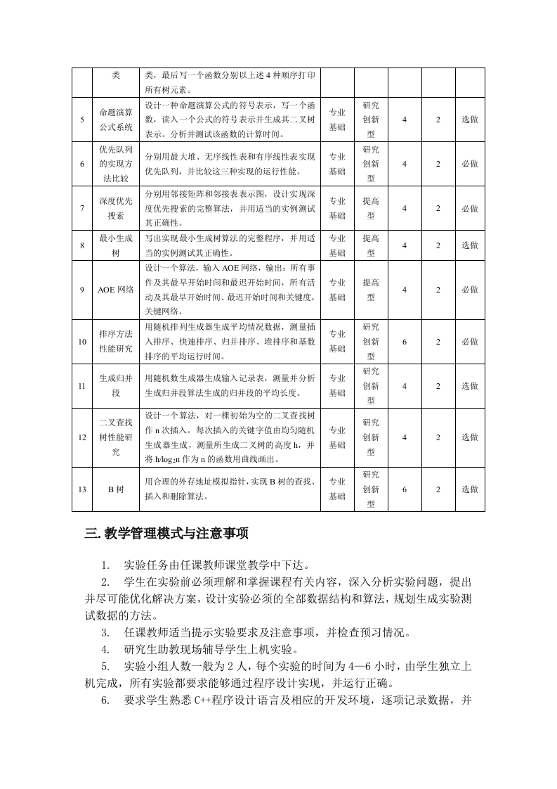 数据结构基础所属课程名称:数据结构基础英文名称:Fundamentals of Data Structure所属课程编号:0901202面向专业:计算机及电类专业课程总学时:64;实验学时32课程学分:4.5一.实验目的通过上机实验,使学生深刻理解基础数据结构和算法的概念并能实际应用和进一步拓展教学内容,系统掌握典型数据结构和算法的设计与分析方法,培养用数据结构对现实对象进行建模并解决实际问题的能力,掌握数据结构的定义、表示以及操作实现相互关联的规律,增强动手能力,增强专业性程序设计和构建软件系统的能力,提高分析问题和解决问题的能力,提高专业素质,培养协作精神和创新能力。二.实验内容、学时分配与组织序实验项目实验性实验学时每组内容提要备注名称质类型分配人数用数组cout表示蟑螂到达每块地砖的次数,蟑螂位置用(,)表示,八个方向的随机游走通过生成均匀分布随机数k(0≤k≤7)模拟。每到专业提高随机漫游达一块地砖,相应次数加1。当蟑螂至少到达42基础型选做每块地砖一次时,模拟完成。应打印最终的count数组设计和实现一个用带头结点的环链表表示单变环链单变量多项式的系统。应使用局部资源管理技术。专业量多项式实现并测试的操作包括:输入、输出、复制构提高2基础型6必做系统造、赋值、析构、相加、相减、相乘和计算多项式的值。定义带头结点的双链环表的模板类,包括DblListNode,DblList和Dbllterator三个模板类专业提高3双链环表除了实现游标成员函数Firs(),Nex(),Not Null()和Next Not Null()之外,再实现一个成基础帝42选做员函数Previous():基于模板写出基于模板的二叉树类定义,并进一步定义专业提高42必做的二叉树二叉树的中序、前序、后序和按层次遍历游标基础型6