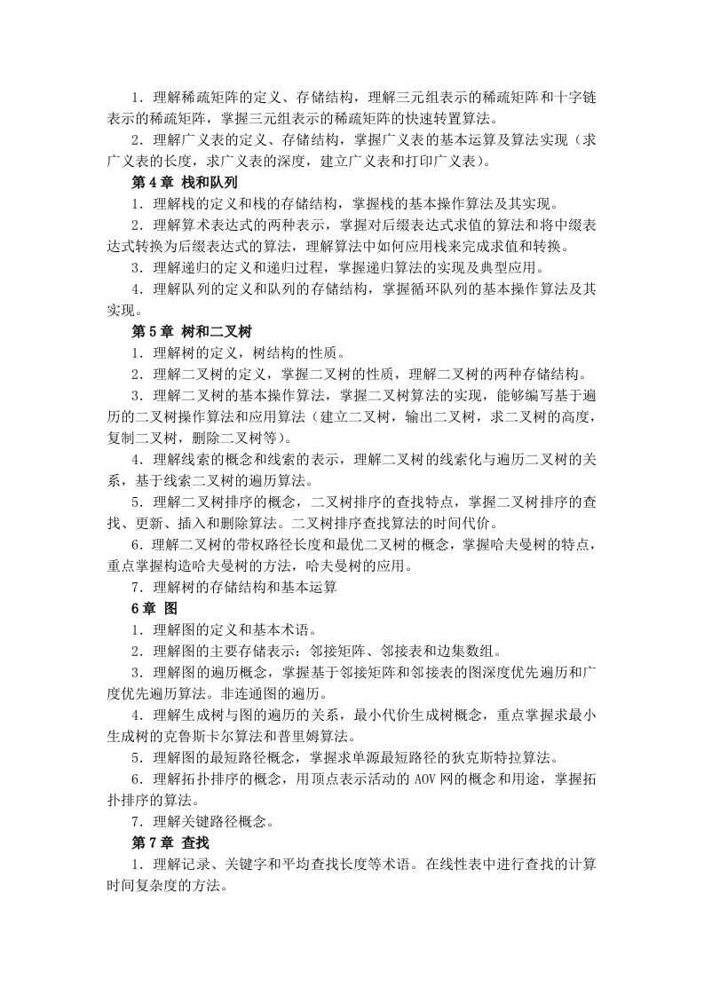 数据结构所属课程名称:数据结构英文名称:Data Structure所属课程编号:0901202面向专业:全校公共选修课课程总学时:48;实验学时16课程学分:3一.课程的性质和目的本课程对非计算机专业的计算机程序设计能力的提高具有重要作用。通过课程学习使学生掌握基本的数据结构以及基于这些结构的典型算法。基本目的是提高学生对抽象概念的理解能力和逻辑思维能力,使学生掌握数据抽象方法,培养学生的算法设计能力,以及运用计算机软件解决问题的能力,进一步提高学生的计算机理论素养。二.课程内容和教学要求(各章、节主要内容,重点及学生所需掌握的程度。例:了解XXX或理解XXX,掌握XXX基本知识等等)第1章绪论1.理解数据结构的基本术语,重点掌握抽象数据类型的概念,抽象数据类型的表示方法。2.理解解算法定义,掌握主要的算法描述方法。3.理解算法评价和算法分析。理解时间复杂性和空间复杂性概念,掌握渐近的时间复杂度表示方法。第2章线性表1.理解线性表的定义和抽象数据类型表示方法。2.线性表的顺序存储和操作实现。理解用含有一维数组的struct结构表示线性表的方法。重点掌握线性表的插入、删除和查找等算法的实现以及时间复杂度的分析。3.线性表的应用一商品库存管理模拟程序。4.理解线性表的链接存储。掌握单链表的结点结构定义。了解循环链表和双向链表的概念和结构特点。5.重点掌握单链表中的查找、遍历、插入与删除等算法的实现及其效率分析。理解并区分由独立结点构成的单链表和由元素结点结点构成的单链表的相同之处和不同之处。能够运用单链表结构解决应用问题。第3章稀疏矩阵和广义表