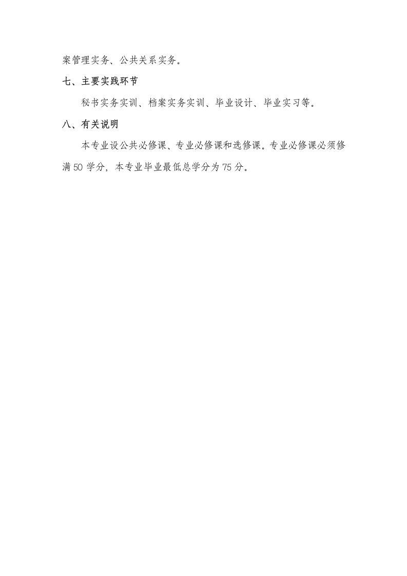丽水学院文秘专业(高起专函授)人才培养方案一、专业名称、层次专业名称:文秘层次:高起专二、培养目标以服务为宗旨,以就业为导向,深化校企合作、工学结合、综合实习,培养具有社会责任感、创新精神和实践能力,基础比较扎实,实践能力强,能够适应地方经济社会发展需要,面向服务、管理第一线的高级技术技能型人才。三、基本要求要求学生具有现代秘书的思想修养和职业道德水准;具备较合理的业务知识结构和较强的实际动手能力及分析和处理日常秘书事务的基本能力。具备一定的办文、办会、办事能力的中级秘书的知识、素养和能力。四、修业年限基本学制三年。学生修完规定的所有课程,完成实践教学任务,经毕业审核,符合条件,准予毕业。五、课程设置、学分、学时安排见附表。六、主要课程社交礼仪、文学欣赏、秘书应用写作、秘书理论与实务、文书档