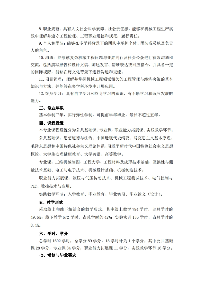 丽水学院机械设计制造及其自动化专业(专升本函授)人才培养方案一、专业基本信息专业名称:机械设计制造及其自动化专业代码:080202办学层次:专升本(函授)二、培养目标与人才规格(一)培养目标培养掌握工程科学基础、专业技术及管理等知识,具有工程实践能力和创新意识、人文素养和职业素养,能在机械工程及相关领域从事机械产品的设计与制造、检测与控制和运行管理等方面工作的高素质应用型工程技术人才,做德、智、体、美、劳全面发展的社会主义事业建设者和接班人。(二)人才规格毕业生应获得以下几方面的知识和能力:1.工程知识:掌握数学、自然科学以及机械工程的基础理论与专业知识,并能够应用于解决复杂机械工程问题。2.问题分析:能够应用数学、自然科学和机械工程的基本原理,并通过文献研究,识别、表达、分析复杂机械工程问题,以获得有效结论。3.设计/开发解决方案:能够设计针对复杂机械工程问题解决方案,设计满足特定需求的机械设备(系统)、零部件(单元)和制造工艺流程,并能够在设计环节中体现创新意识,考虑社会、健康、安全、法律、文化以及环境等因素。4.问题研究:能够基于机械工程的原理与方法对复杂机械工程问题进行研究,包括设计实验方案、进行实验、分析和解释数据,并通过数据处理与信息综合得到合理有效的结论。5.使用现代工具:能够针对复杂机械工程问题,选择与使用恰当的技术、资源、现代信息技术工具,包括对复杂工程问题的预测与模拟,并能够理解其局限性。6.工程与社会:能够基于机械工程相关背景知识进行合理分析、评价机械工程实践和复杂机械工程问题的解决方案对社会、健康、安全、法律以及文化的影响,并理解应承担的社会责任。7.环境和可持续发展:能够理解和评价针对复杂机械工程问题的专业工程实践对环境、社会可持续发展的影响。