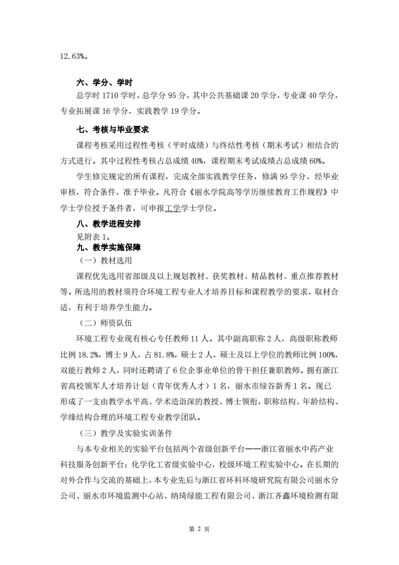 丽水学院环境工程专业(专升本函授)人才培养方案一、专业名称、层次专业名称:环境工程专业代码:082502办学层次:专升本(函授)二、培养目标与规格环境工程(专升本函授)专业旨在培养德、智、体、美、劳全面发展,具有可持续发展理念,具备环境工程专业的基本理论,基本知识和基本技能,系统掌握环境工程专业的基本理论和实践技能,掌握污染防治、了解环境规划和资源保护等方面的知识,了解环境科学与技术发展动态,学生具备可持续发展理念,具有进行污染控制工程的设计及运营管理、环境监测、制定环境规划和进行环境管理的能力,具有从事环境工程方面的新工艺和新设备的研究和开发能力,能在政府相关部门、环境工程设计单位、相关企事业单位等从事工程设计、咨询、双碳相关工作和环境管理等方面工作的应用型人才。三、修业年限基本学制三年,实行弹性学制,可提前半年毕业,最长不超过五年。四、课程设置本专业课程设置分为公共基础课、专业课、职业能力拓展课、实践教学环节。公共基础课:思想道德与法治、中国近现代史纲要、马克思主义基本原理、毛泽东思想和中国特色社会主义理论体系、习近平新时代中国特色社会主义思想概论、大学生心理健康教育。专业课:无机及分析化学(含实验)、环境化学、环境监测及实验、水污染控制工程及实验、大气污染控制工程及实验、环境工程微生物学、环境影响评价、固体废物处理处置、物理性污染控制工程、环境生态学。职业能力拓展课:高等数学、工程制图、环境统计、仪器分析、环境保护法与环境标准实践教学环节:入学教育、毕业教育、毕业实习、毕业论文。五、数学形式采取线上和线下相结合的教学形式,其中线上教学972学时,占总学时的56.84%;线下教学522学时,占总学时的30.53%,实验实训216,占总学时的第1页