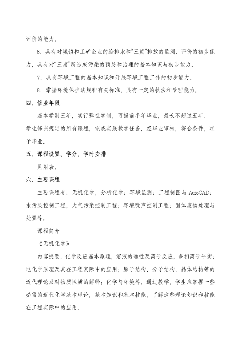 丽水学院环境工程专业(专升本函授)人才培养方案一、专业名称、层次专业名称:环境工程层次:专升本二、培养目标培养适应我国现代化建设实际需要,德、智、体、美全面发展,较全面地掌握环境工程理论基础、基本知识及基本技能,具有理工兼备的较宽广的专业知识、较强的英语应用能力和实际动手能力,良好的人文素质和创新精神,并在固体废物处理、污水处理、环保设备和环境化学-生物技术等一个或两个方向上具有专长的复合型高级工程师或研究型人才。毕业生可以根据自己的专业方向特色,到相应的环保、环卫和工厂公司等企事业单位或高等院校、管理部门及其相关领域从事设计、研究开发、教学及管理等方面的工作,也可以选择到国内外相近学科的研究教学单位或行业继续深造或工作。三、基本要求1.具有应用计算机进行数据处理和解决本专业问题的初步能力。2.具有环境保护、环境监测、环境工程、环境评价、环境管理等方面的基本知识。3.掌握化学分析的基础理论和实验方法,具有化学分析的基本技能。4.掌握本专业常用分析仪器的使用方法。5.具有对水、大气、固体污染和环境灾害进行调查、监测、分析和综合