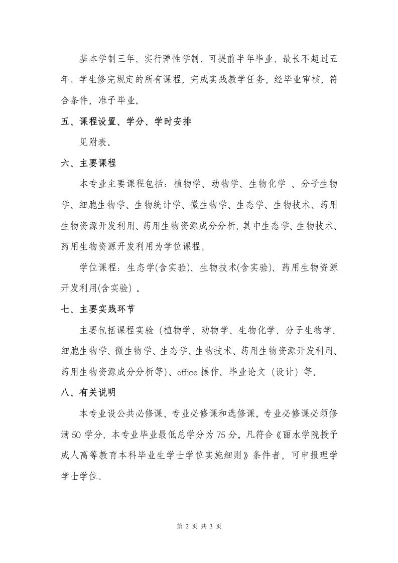 丽水学院生态学专业(专升本函授)人才培养方案一、专业名称、层次专业名称:生态学层次:专升本二、培养目标本专业着重培养具备扎实的生态学、生物学、中药学及其他相关自然科学基础知识,具备药用生物资源调查研究、生产保护、综合评价、开发利用、经营管理等方面的基础理论知识和基本技能,能在野生动物植物管理和医药管理部门、药用资源研究部门、中药材生产加工基地等单位从事药用生物资源调查、保护、生产加工、质量监控检测、产品开发利用、资源经营管理等工作的人才。三、基本要求为满足社会对药用生物资源方面的专业人才需求,生态学专业重点培养具备复合型知识结构的人才队伍,学生既要掌握扎实的生物学、生态学、中药学方面的基本理论知识,同时要学习相关的数理化基础和人文社科知识,接受基础研究、应用研究方面的创新思维和科学研究训练,掌握扎实的学科理论和基础知识,有良好的社会责任感和职业道德品质,遵纪守法,具有艰苦、求实和勇于创新的精神;具有良好的科学素养,能运用现代生态学理论知识进行应用研究、技术开发和科学管理。四、修业年限第1页共3页