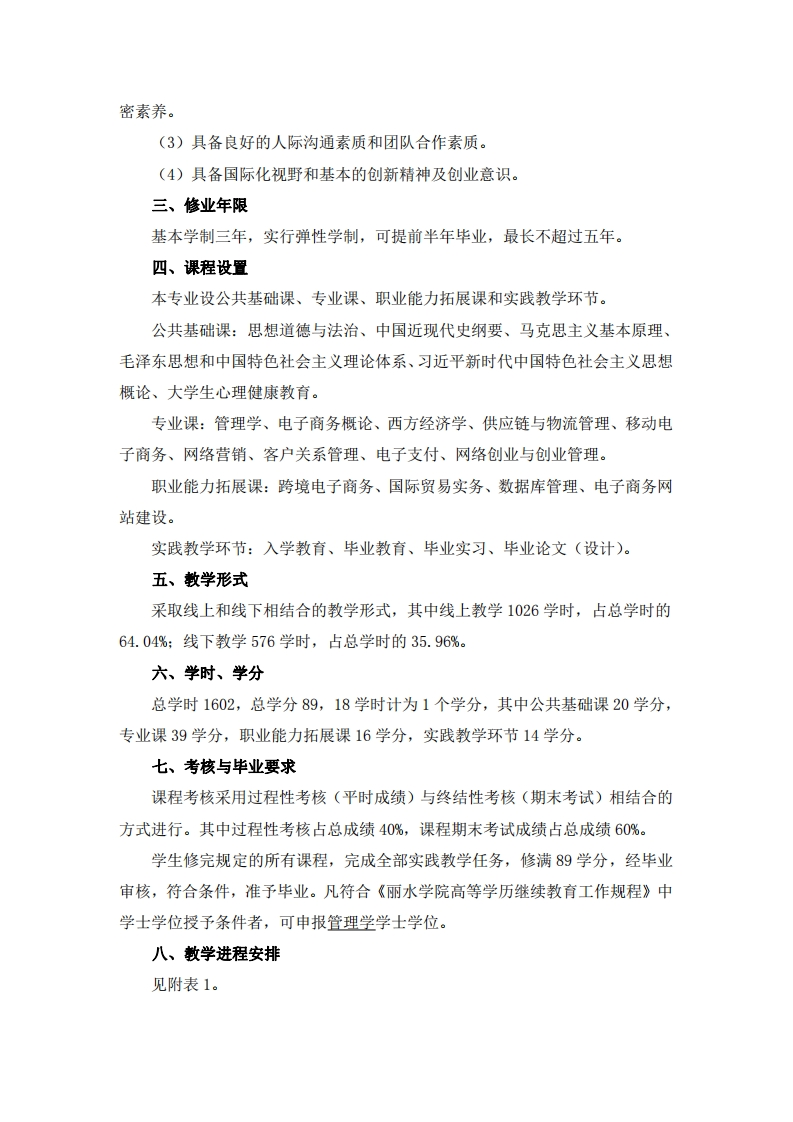 丽水学院电子商务专业(专升本函授)人才培养方案一、专业基本信息专业名称:电子商务专业代码:120801办学层次:专升本(函授)二、培养目标与人才规格电子商务专业培养具备现代管理和信息经济理念、掌握信息技术和电子服务综合技能、具有扎实的专业基础和良好的知识结构,具备一定的互联网创新创业素质,同时具备较强的电子商务模式(B2B,B2C,C2C等)的实际操作能力、网络营销能力、电子商务网站管理和营运能力、客户服务与客户管理能力,在工商类企业、网络服务类企业等领域从事电子商务运营、专业管理和技术服务的应用型专业人才。(一)知识要求(1)掌握自然科学、社会科学和人文学科等通识类相关知识。(2)掌握现代管理、网络经济和信息技术相关的基本理论和专业知识。(3)掌握电子商务类专业理论与专门方法,能够理论与实践紧密结合,解决实际问题。(4)了解快速发展的电子商务新兴产业动态,注重产业技术创新和商业模式创新并及时掌握相应的理论与技术知识。(二)能力要求(1)具备独立自主地获取本专业相关知识的学习能力。(2)具备将所获取的知识与实践融会贯通并灵活应用于电子商务实务的技能。(3)初步具备基于多学科知识融合的创意、创新和创业能力。(4)具备良好的外语听、说、读、写能力。(5)具备良好的计算机操作与互联网应用能力。(三)素质要求(1)具备较高的思想政治素质和良好的道德素养、人文素养、科学素养和职业素养。(2)具备较高的网络文明素养、电子商务诚信与信用素养、信息安全与保