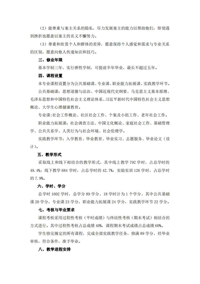 丽水学院社会工作专业(高起专函授)人才培养方案一、专业基本信息专业名称:社会工作学科代码:590101办学层次:高起专(函授)二、培养目标与人才规格本专业主要培养具有相应的社会工作理论知识和实践技能,熟悉社会工作政策、法规,具备在社会工作价值观指导下,综合运用个案、小组和社区工作方法,为服务对象提供专业服务,能在民政、劳动与社会保障、卫生、工会、青年、妇女等社会组织及其他社会福利、服务和公益团体等机构从事社会保障、社会行政管理、社区发展与管理、社会服务与评估等工作的应用型人才。主要职业定位为各街道、社区服务中心、老年服务机构、老年保健机构以及青少年矫正培训机构、企事业单位、社会公益机构。1.知识结构(1)掌握社会工作基础知识、通识知识和工作方法(2)掌握社会工作法规和政策,了解基层工作职责、流程和方法,掌握基本的组织和管理技巧(3)掌握各类社会调查方法,具备开展社区和家庭调查能力2.能力结构(1)项目管理能力:具备志愿者的招募和管理、项目资金募集、民间非营利组织的管理及政府项目的申报、实施和评估能力。(2)社会工作方法的掌握与运用能力:能运用所掌握的个案社会工作、小组社会工作、社区社会工作等三个基本社会工作办法的来解决家庭、社区、社会等面临的一般社会问题。(3)社会活动能力与人际关系沟通能力:善于与服务对象、政府、企业、社会组织、新闻媒体等进行有效的公共关系协调与人际关系沟通,以达到服务社会的目的。3.素质结构(1)承认社会工作的专业价值观,具备从事社会工作的丰富知识和个人能力,有专业使命感和目标责任感。