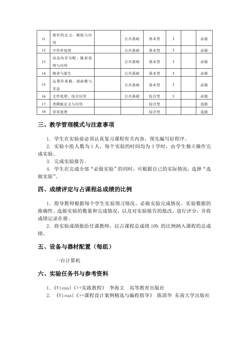 程序设计基础及语言(I)所属课程名称:程序设计基础及语言英文名称:Fundaments of Programming and Programming Language面向专业:理工科非电类课程总学时:24+32实验学时24+24课程学分:3.5一、实验目的程序设计基础及语言实验是《程序设计基础及语言》课程中重要的教学环节,通过实验教学,验证、巩固和补充课堂讲授的理论知识。主要目的是使学生通过上机实验,真正领会C+语言的功能和作用,理解程序的编译、运行机理,加深对算法的程序实现本质的认识,熟练掌握运用C+语言编写程序,在机上调试运行程序的方法,从而具备较好的程序设计能力和解决问题的能力,并积累一定的实践经验,为今后在专业领域中用计算机解决问题打下扎实基础。二、实验内容、学时分配与组织学时每组序号实验项目名称内容提要实验性质实验类型备注分配人数第一阶段Visual C++集成开发环公共基础基本型必做境(DE)2条件分支和开关语句公共基础基本型3必做3循环语句和嵌套循环公共基础基本型3必做简单算法〔枚举法,递4公共基础基本型3必做推法,迭代法)函数的参数传递、变量基本型必做的存储类别与作用域函数的递归算法和函数6公共基础基本型3必做的重载>文本文件的读写公共基础基本型3必做综合应用程序公共基础基本型3必做第二阶段9类与对象的定义与应用公共基础基本型3必做数组的定义、初始化,主要应用:10公共基础基本型必做数组应用排序与查找