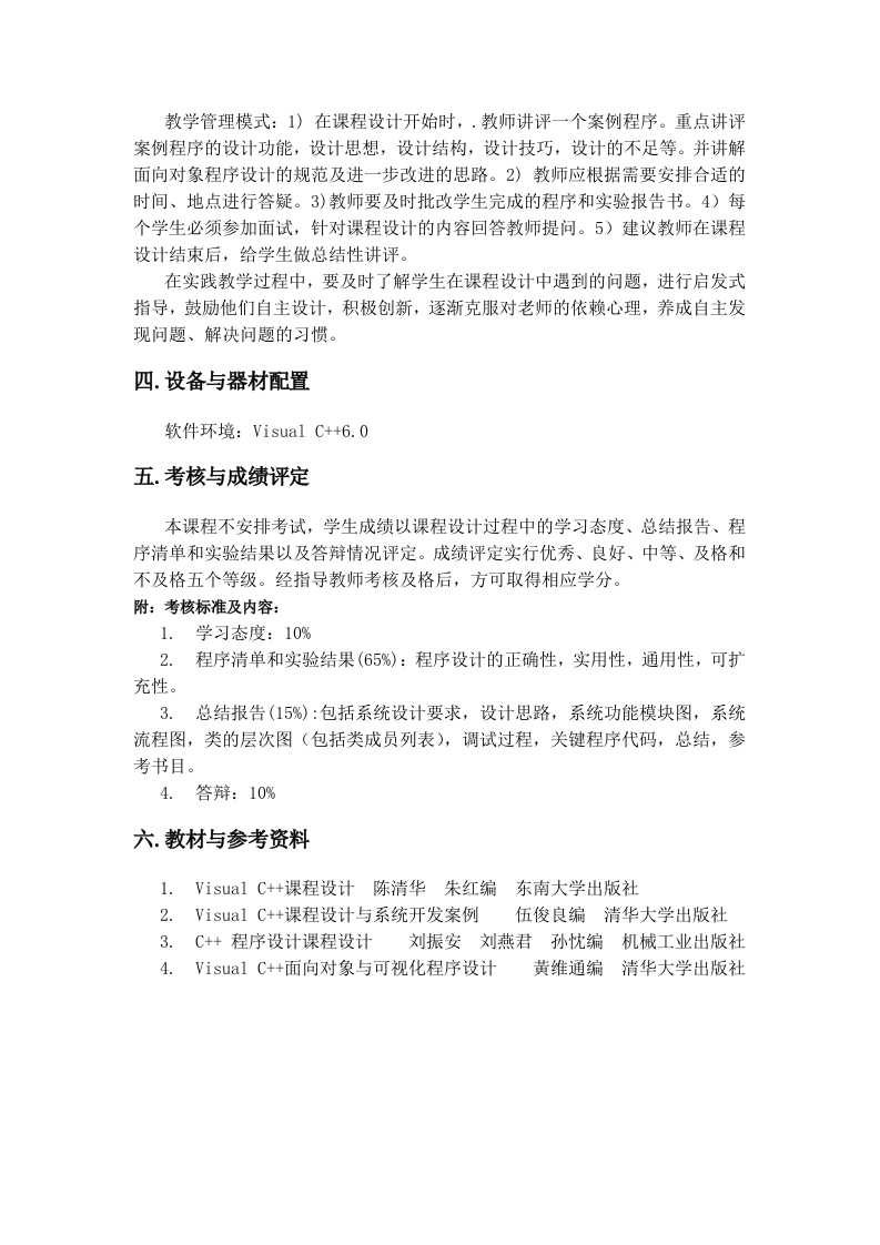 程序设计综合课程设计(Ⅱ)课程设计名称:程序设计综合课程设计()英文名称:Course Design of Programming面向专业:计算机专业课程总学时:12+56;讲授学时12;实验学时56课程学分:1.5一.本课程设计或综合实践(在人才培养中的)作用和具体目标C++语言课程设计是计算机科学与技术专业实践性环节之一,是学习完第一门语言《C+程序设计语言》课程后进行的一次全面的综合练习。主要目的是通过实践使学生加强对程序设计语言课程知识点的理解和掌握,培养学生对课程知识综合运用能力、实际分析问题能力及编程能力,养成良好的编程习惯。使学生通过实践进一步领会程序设计的特点和应用,提高运用C+语言以及面向对象知识解决实际问题的能力。使学生通过实践掌握用C++语言编写面向对象的实用程序的设计方法,对面向对象方法和思想增加感性的认识:学会利用C++程序设计语言编写出一些短小、可靠的Windows实用程序,切实提高面向对象的程序设计能力。为后续的相关课程的学习打下基础。二.设计(或实践)内容,学时分配与组织设计(或实践)序号学时每组内容提要备注项目名称分配人数1案例程序面向对象程序设计方法3讲课2可视化应用程序设计MFC对话框、菜单设计、序列化和文件操作、文档与视图9讲课3数学问题求解程序设计计算器、各种进制转换、八皇后问@6字符串处理程序设计字符及字符串查找、删除、替换、匹配等操作615矩阵及向量处理程序设计模板实现矩阵的基本运算(加、减、乘、数乘、转置)66文件操作文件建立、记录的更新、插入、删除及随机访问1基本数据结构应用程序设模板实现矩阵链表堆栈操作(如建立、插入、删除、查7计找、合并、逆置等)103面向对象用面向对象程序设计方法设计一个管理程序〔工资管实用系统分析与设计理、物品库存管理、电话簿管理、教学事务管理等)203三.教学管理模式与注意事项