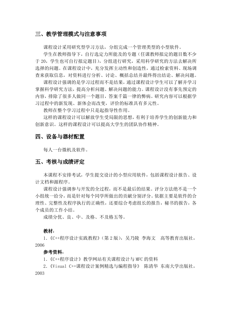 程序设计综合课程设计(I)课程名称:程序设计综合课程设计英文名称:Course design of Programming面向专业:对计算机要求较高的理工科专业课程总学时:40;授课学时:16;实验学时:32(含课外8);课程学分:1;一、课程设计作用和具体目标本课程设计是《程序设计基础与语言》课程的组成之一,也是它的继续和延伸。采用研究型学习方法,分组完成一个管理类型的小型软件。在课程设计前期安排学习MF℃编程和面向对象的软件工程(包括使用UL进行面向对象的系统分析和设计)的有关知识,以自学和上机实验为主。开设本课程的目的是使学生通过参加小型软件的开发过程,进一步掌握面向对象的程序设计方法,使学生具有团队协作精神,并培养学生的创新能力和创新意识。二、教学内容与学时分配与组织1.程序设计综合课程设计(I)在学习《程序设计基础与语言(I)》课程后实施。2.在《程序设计基础与语言(I)》课程结束时布置学生自学MFC编程和面向对象的软件工程的有关知识(《C++程序设计实践教程》中的第2、3、4章)。3.短学期开始第一节课讲解研究型学习方法,并进行分组。分组以4人较合适。分组以自愿为主,但教师必须按学生能力和学习成绩调配人员组成。每个小组选出组长和秘书。各小组通过调研决定课程设计项目,并分工合作完成该项目。4.授课学时分配:8学时用于讲授基本概念和编程演示。8小时用于各小组介绍和汇报项目方案与进展、遇到的困难与解决方法,采用课堂讨论与教师指导相结合的教学模式。上机学时为32(含8学时课外上机)。其中16个学时用于MFC编程实验,包括4个实验:a)对话框与控件4学时b)文档-视图结构及图形与文本输出4学时c)序列化和文件操作4学时d)多文档与多重视图4学时16个学时用于软件设计。