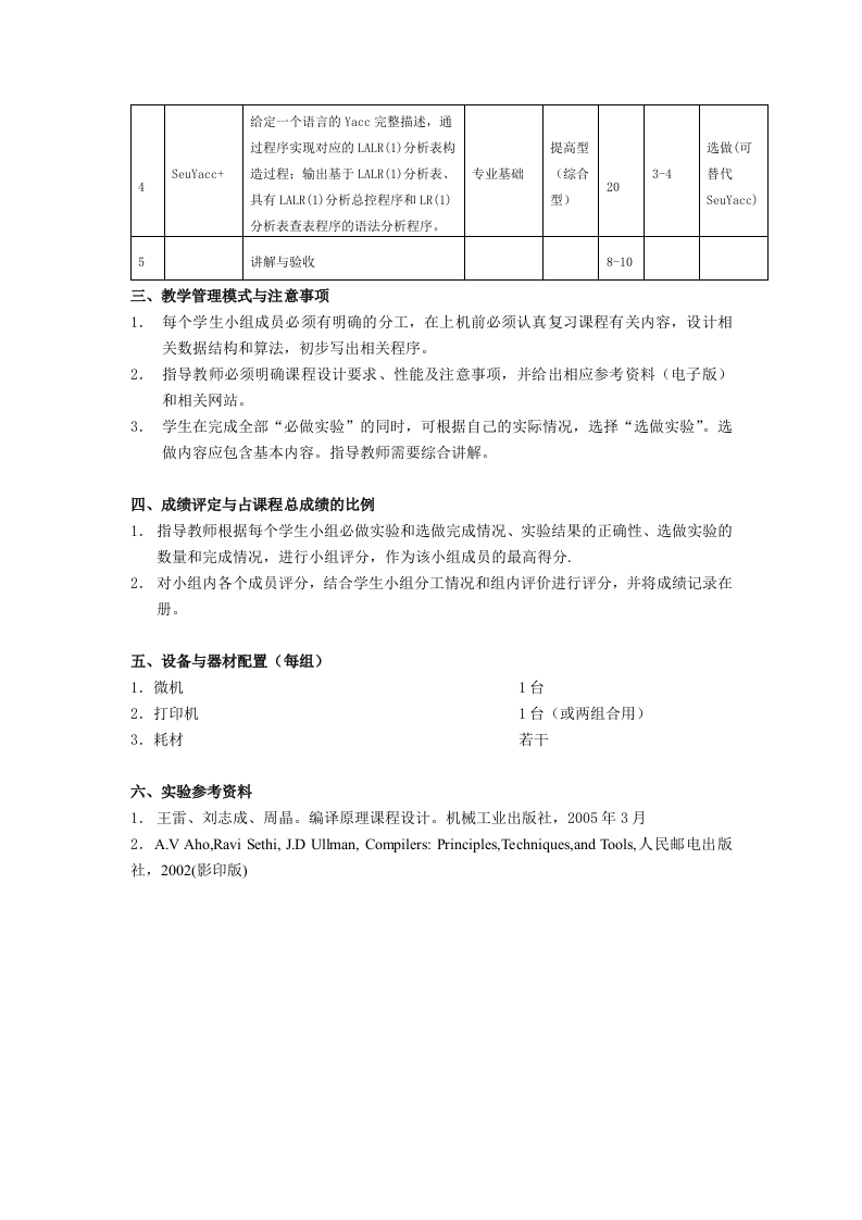 编译原理课程设计课程名称:编译原理课程设计英文名称:Project design of Principles of Compilers面向专业:计算机科学与技术课程总学时:40;实验学时24:课程学分:15:一、课程设计目的编译原理是计算机专业的核心课程。该课程能够加深学生对计算机程序本质的理解、提高学生的计算机系统分析能力、引导学生如何编好程序具有重要作用。在课程理论教学中,较多地是讲解程序理论和编译程序构造原理。该课程设计的主要目的就是通过设计一个通用的能够自动根据正规表达式生成词法分析程序的工具程序SeuLex和一个通用的能够根据上下文无关文法及其语义规则自动生成语法分析程序的工具程序SeuYacc,使学生充分理解课程理论内容和工具软件的实现技巧,掌握所涉及的典型数据结构、算法及方法,为今后在大型软件系统实践中设计性能优良的软件系统打下基础。二、实验内容、学时分配与组织序实验项目实验种学时每组备注内容提要实验性质号名称类分配人数给定一个语言的Lex部分描述,通过程序实现对应的正规表达式集分析、基本型SeuLex相应非确定的有限自动机构造和确专业基础1开放型123-4定化:根据确定化后的自动机生成对必做应的词法分析程序。给定一个语言的Lex完整描述,通过程序实现对应的正规表达式集分析、提高型选做(可SeuLex+相应非确定的有限自动机构造、确定专业基础(综合3-4替代162化和最小化:根据最小化的确定有限型)SeuLex)自动机生成对应的词法分析程序。给定一个语言的Yacc部分描述,通过程序实现对应的LR(1)分析表构造基本型SeuYacc过程:输出基于LR(1)分析表、具有专业基础3开放型163-4LR(1)分析总控程序和LR(1)分析表必做查表程序的语法分析程序。