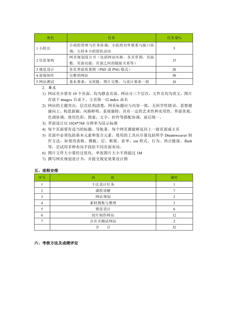 网站设计Web-Site Design(课程编号:9900005学分:1学时:32)东南大学计算机基础课程教学指导委员会一、课程的性质与目的通过本课程的学习使学生草握网页制作、网站设计的基本知识、基本理论和基本应用等方面的内容。本课程的主要任务是介绍利用Dreamweaver开发工具进行网页设计,包括新建、编辑和设置一个Wb站点:如何对页面属性进行基本的设置,如何设置、编辑CSS层叠式样式表:如何排版文字、表格和层:如何进行基本的图像处理:建立框架:模板和库的使用和编辑等。通过本课程的学习,培养学生的实际动手能力和计算机的操作能力,能够运用所学的知识进行一次全面综合的网页设计练习,目的在于加深对网站设计基本流程的理解,掌握使用网站设计工具的基本方法,提高解决实际问题、设计开发网站的实践能力。同时课程设计需充分体现“教师指导下的以学生为中心”的教学模式,以学生为认知主体,充分调动学生的积极性和能动性,重视学生自学能力的培养。本课程的先修课程是《Photoshop图形图像(文科)》。二、教学内容和教学要求本课程要求学生掌握基本的HTML语言。学会使用Dreamweaver开发工具进行网页设计。这是一门重在实践的科目,因此需要学生多上机、多进行实际操作,把老师所教授的各种网页制作、版面设计以及程序熟练制作或调试出来,并且能够在此基础上有所创造、有更进一步的发挥第一章网页设计概述第二章初识Dreamweaver第三章网页基本元素第四幸网页布局第五章CSS第六章使用库、模板和行为三、课外实践要求课外分为两个阶段,第一阶段以掌握基本网站设计软件的使用,加深对基本技能的掌握。第二阶段综合前一阶段的学习成果,设计一个综合型网站。四、设计任务及要求1.任务为具可比性,选择某特定网站为素材制作网站,要求与原版面有明显改变(组织结构色彩风格等)。采用分组设计方式,体现网站制作过程的合作性。以4一5人为一小组,小组成员角色分配如下表(一人可担任多个角色)
