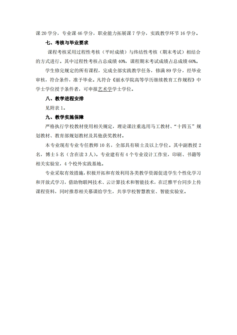 丽水学院视觉传达设计专业(专升本业余)人才培养方案一、专业基本信息专业名称:视觉传达设计专业代码:130502办学层次:专升本(业余)二、培养目标与人才规格培养具有国际设计文化视野,中国设计文化特色,适合于创新时代需求,集传统平面(印刷)媒体和现代数字媒体,在专业设计领域,企业,传播机构,大企业市场部门,从事视觉传播方面的设计高素质高等技能型和应用型、可持续发展的视觉设计专门人才。了解中外人文历史,掌握设计学、设计的基本理论:具有较强的策划、设计能力以及图文编辑制作能力:了解艺术设计在国内外的现状及发展趋势,有较全面的文化艺术修养、审美趣味和鉴赏力、交际能力。三、修业年限基本学制三年,实行弹性学制,可提前半年毕业,最长不超过五年。四、课程设置本专业课程设置分为公共基础课、专业课、职业能力拓展课、实践教学环节。公共基础课:思想道德与法治、中国近现代史纲要、马克思主义基本原理、毛泽东思想和中国特色社会主义理论体系、习近平新时代中国特色社会主义思想概论、大学生心理健康教育。专业课:中外设计史、字体与版式设计、数字媒体设计、广告设计、品牌形象设计与推广、标志设计、文创设计、包装设计、计算机辅助设计、动态图像设计、UI设计。职业能力拓展课:设计综合创作、设计调研服务。实践教学环节:入学教育、毕业教育、毕业实习、毕业论文(设计)。五、教学形式采取线上和线下相结合的教学形式,其中线上教学990学时,占总学时的61.8%:线下教学612学时,占总学时的38.2%。五、学时学分总学时1602学时,总学分89学分,18学时计为1个学分,其中公共基础