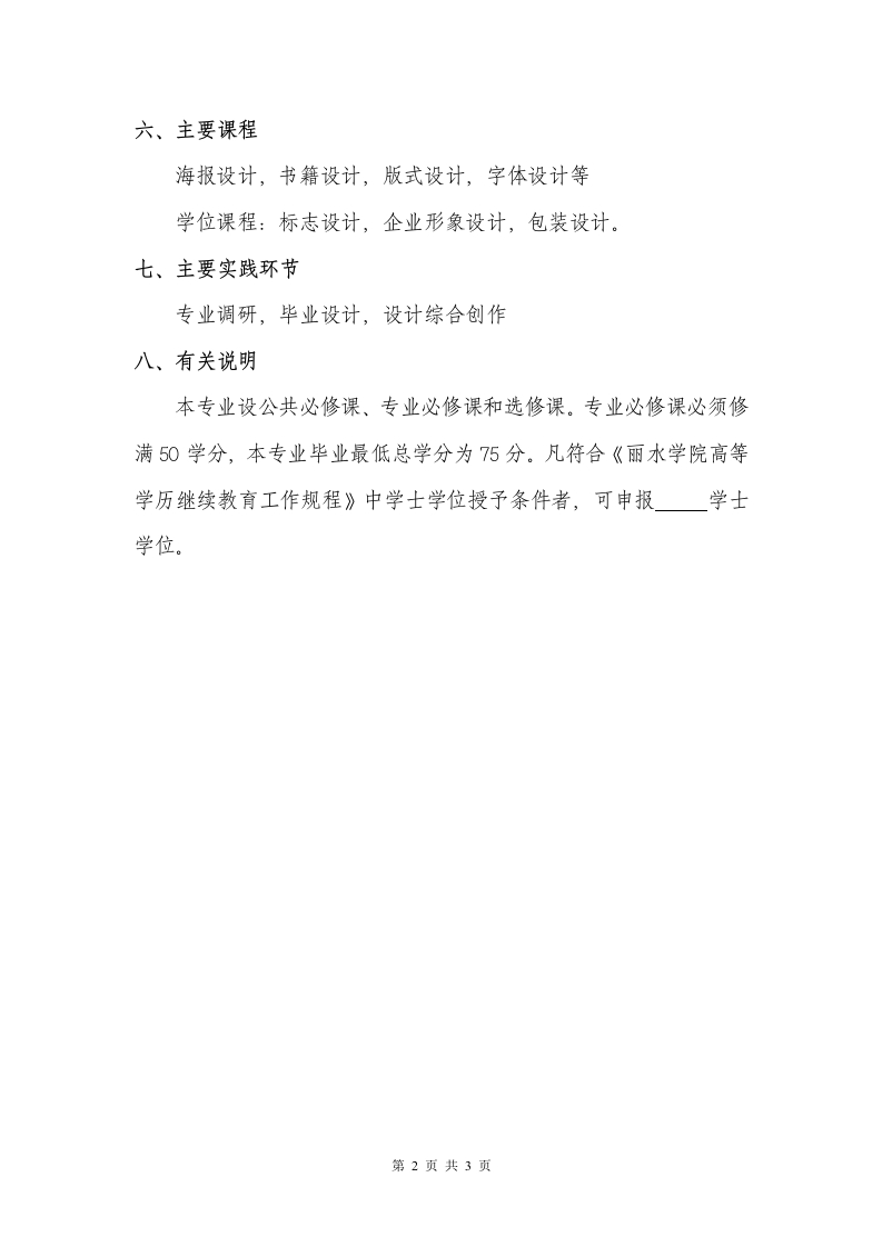 丽水学院视觉传达设计专业(专升本业余)人才培养方案标准格式一、专业名称、层次专业名称:视觉传达设计层次:专升本二、培养目标培养具有国际设计文化视野,中国设计文化特色,适合于创新时代需求,集传统平面(印刷)媒体和现代数字媒体,在专业设计领域,企业,传播机构,大企业市场部门,从事视觉传播方面的设计高素质高等技能型和应用型、可持续发展的视觉设计专门人才。三、基本要求了解中外人文历史,掌握设计学、设计的基本理论;具有较强的策划、设计能力以及图文编辑制作能力;了解艺术设计在国内外的现状及发展趋势,有较全面的文化艺术修养、审美趣味和鉴赏力、交际能力。四、修业年限基本学制三年,实行弹性学制,可提前半年毕业,最长不超过五年。学生修完规定的所有课程,完成实践教学任务,经毕业审核,符合条件,准予毕业。五、课程设置、学分、学时安排见附表。第1页共3页
