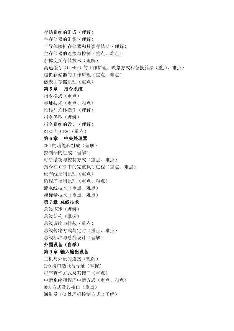 计算机组织与结构(总学分:4总上课时数:64实验:12)东南大学计算机科学与工程学院一.课程的性质与目的本课程是计算机专业及电类专业必修的一门主要的专业基础课。本课程系统地介绍计算机的组成结构及各组成部分的工作原理,其内容着重于基本概念、基本原理的学习,同时也体现最新的成果。通过学习本课程,培养学生初步建立计算机的整机概念,掌握计算机的五个功能部件的组成原理,逻辑实现、设计方法及其互连结构,并奠定良好的计算机硬件基础,为今后参加计算机系统的分析设计、开发工作打下一个良好的基础。二.课程内容的教学要求第1章概论存储程序与冯诺依曼体制(重点)计算机的硬件组成(理解)计算机系统及其层次结构(理解)计算机的主要性能指标(了解)第2章数据的表示数值数据的表示(重点)机器数的定点表示和浮点表示(重点、难点)非数值数据的表示(了解)十进制数和数串的表示(了解)校验码(重点)第3章运算方法和运算器运算器的功能与组成(理解)加法器的逻辑设计(重点)定点加减运算(重点)带符号数的移位和舍入操作(理解)定点乘法运算(重点)定点除法运算(理解)规格化浮点运算(重点)十进制整数的加法运算(了解)逻辑运算与实现(理解)第4章存储系统