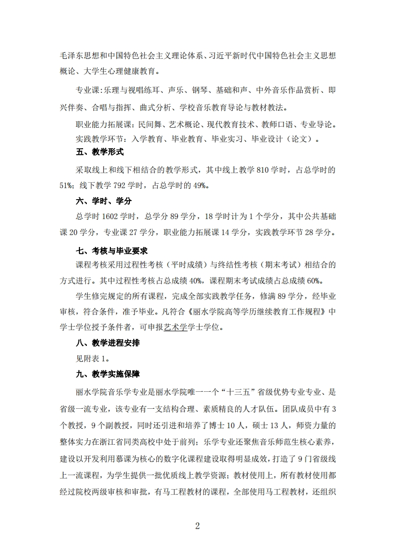 丽水学院音乐学专业(专升本业余)人才培养方案一、专业基本信息专业名称:音乐学专业代码:130202办学层次:专升本(业余)二、培养目标与人才规格(一)培养目标本专业根据基础教育改革与发展对中学音乐教师的要求,立足丽水、面向浙江、辐射全国,以“高师德修养、厚专业功底、宽学科知识、强教学技能、突地方特色”为理念,培养“师德高尚、技能过硬、体格强健、素养全面、特色鲜明”的中学音乐教师,能够在中学及其他教育机构从事音乐教学与研究的专业人才。(二)人才规格在教育教学工作中自觉践行社会主义核心价值观,增进对习近平新时代中国特色社会主义思想认同、政治认同、理论认同和情感认同。贯彻党的教育方针,以立德树人为己任。遵守教师职业道德规范,具有依法执教意识,立志成为有理想信念、有道德情操、有扎实学识、有仁爱之心的好老师。热爱教育事业,具有从教意愿,认同教师工作的意义和专业性,具有积极的情感、端正的态度、正确的价值观。具有人文底蕴和科学精神,尊重学生人格,富有爱心、责任心,工作细致、耐心,做学生锤炼品格、学习知识、创新思维、奉献祖国的引路人。掌握音乐学科的基本知识、基本原理和基本技能,理解音乐学科知识体系基本思想和方法,了解音乐学科与其他学科的关系,了解音乐学科与社会实践的联系,对音乐学科相关知识有一定的了解。三、修业年限基本学制三年,实行弹性学制,可提前半年毕业,最长不超过五年。四、课程设置本专业课程设置分为公共基础课、专业课、职业能力拓展课、实践教学环节。公共基础课:思想道德与法治、中国近现代史纲要、马克思主义基本原理、
