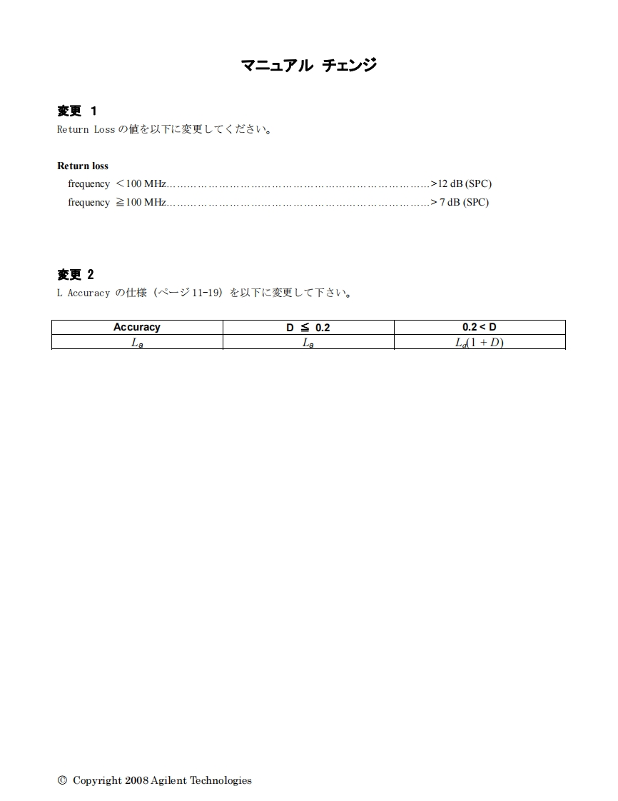 Agilent 4395A Network/Spectrum/Impedance Analyzer Operation ManualManual ChangeAgilent Part No.N/AFeb 2008Change 1Change the value of Return loss to the following.Return lossfrequency <100 MHz.......................>12dB(SPC)frequency 2100 M7dB (SPC)Change 2Change the specification of L Accuracy (Page 11-19)to the following.AccuracyD≤0.20.2