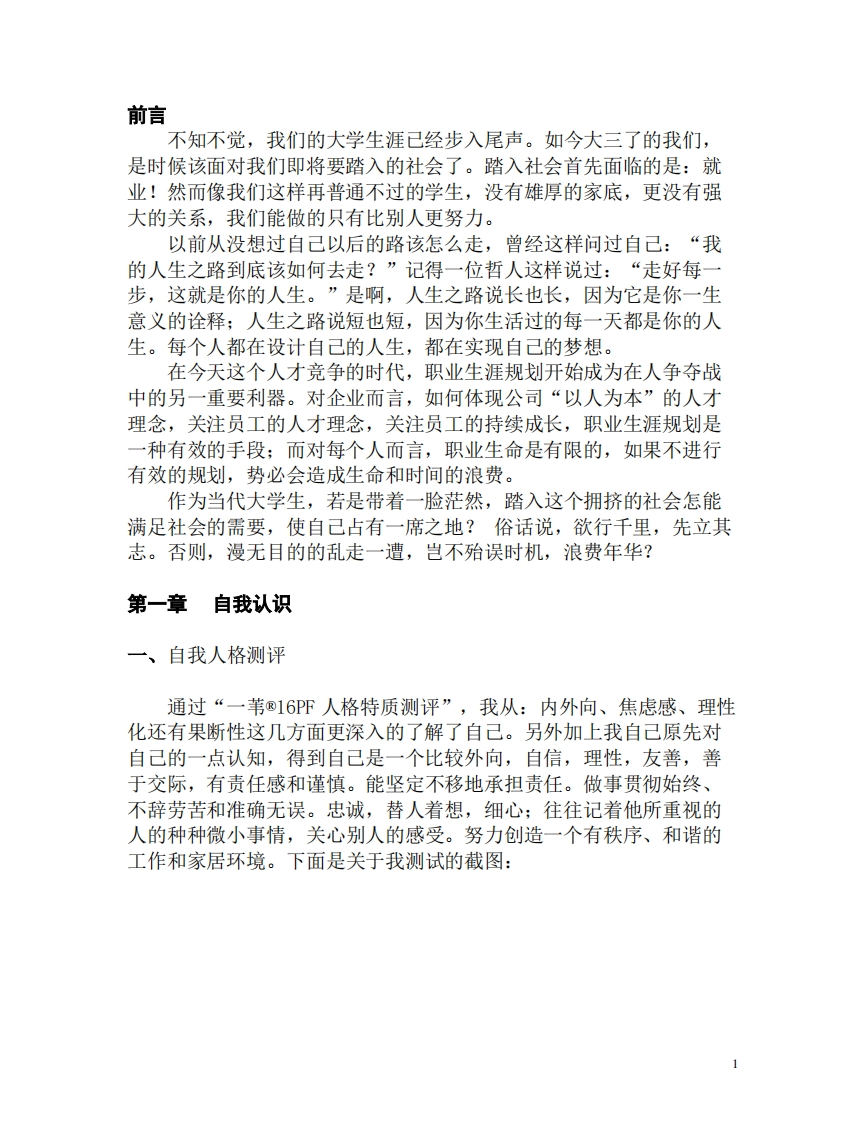 大学生职业生涯规划书(石油化工类)348072@abc6个月前发布关注私信0.32MB9页020大学生职业生涯规划书(石油化工类)此内容为付费资源,请付费后查看¥16¥23黄金会员免费钻石会员免费立即购买您当前未登录!建议登陆后购买,可保存购买订单付费资源 第1页 / 共9页 第2页 / 共9页 试读已结束,还剩7页,您可下载完整版后进行离线阅读 THE END招生策划 文本预览 目录前言….1第一章自我认知..1、自我人格测评…二、自我职业锚析…2第二章】职业认知…3三家庭环境分析…3学校环境分析……3、社会环境分析…3四、职业环境分析…4五、行业环境分析…………4六、走出职业认知区……5第三章]职业规划设计.…6一、有确定目标和途径……6制定行动计划…。…6三评估与各选方案…6四、结束语……8 查看更多 收起部分 喜欢就支持一下吧收藏