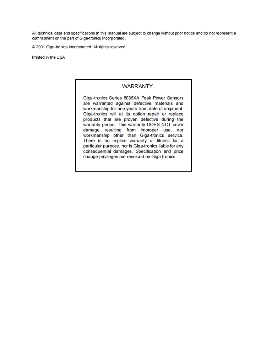 Giga-tronicsManual Part Number:21568Revision:Print Date:March 2008Gigatronics∈Giga-tronicsCE80350A65PO%8腰NS0R⊙SERIAL NO.1234567Giga-tronics80350A号5MP968器s0R⊙SERIAL NO.1234567Series 8035XA Peak Power SensorsOperation Maintenance Manual8035XAC€...Certified Product1S09001....Certified ProcessRegistrar:BSI,Certification No.FM 34226 v Registered 04 June 1996 v Amended 01 March 2000Giga-tronics Incorporated v4650 Norris Canyon Road v San Ramon,California 94583925.328.4650or800.726.4442v925.328.4700(Fax)v800.444.2878(Customer Service)v925.328.4702(CS Fax)www.gigatronics.com