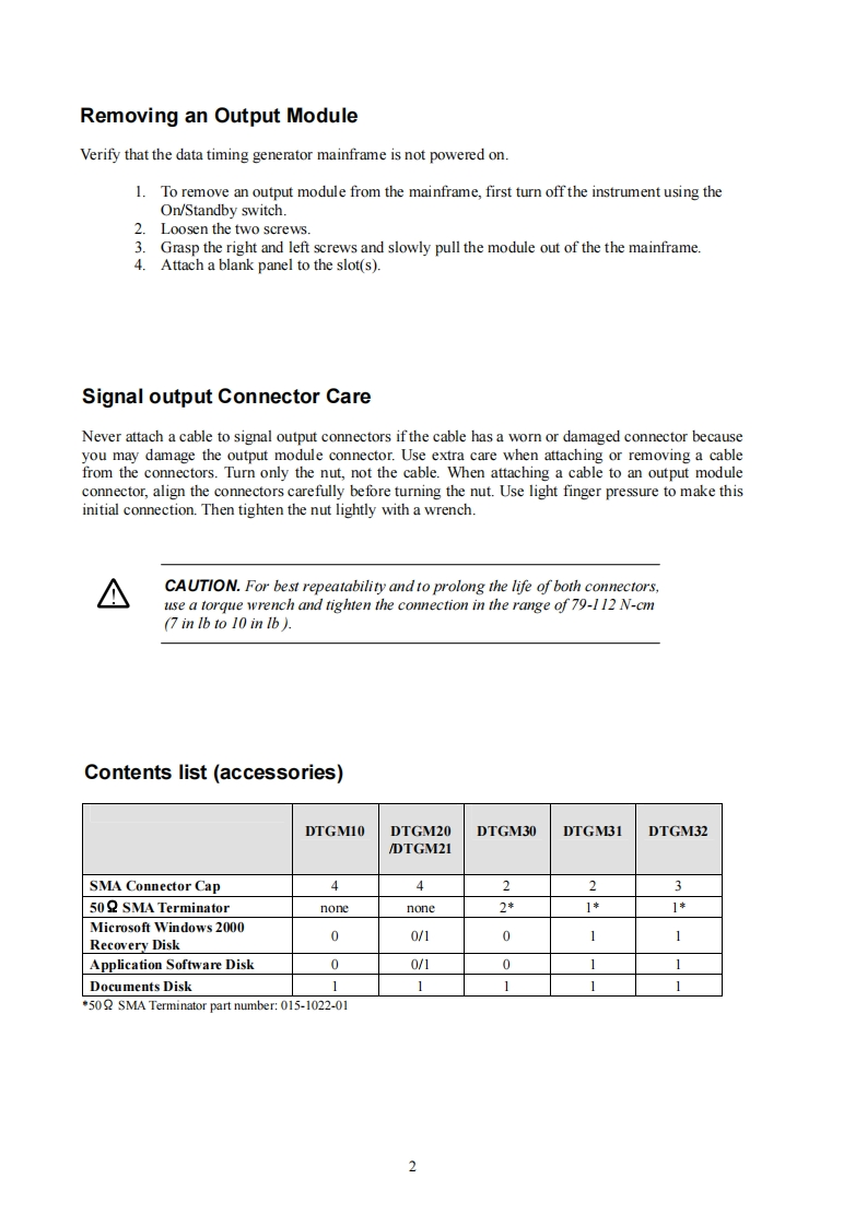 Installing the Output Module inthe DTG5000 series Data Timing GeneratorThe DTG5000 Series Data Timing Generator mainframe and output module(s)are shipped separately.The DTGM10,DTGM20,DTGM21,DTGM30,DTGM31 and DTGM32 are output modules that canbe used with the DTG5000 mainframe.These modules can be used in any combination and in any slot.There are functional differences between slot A though slot D and slot E though slot H.Refer to theMainframe and Output Configuration subsection in the DTG5000 User Manual.It is recommendedthat you use slot A when only one output module is installed in the mainframe.Electrostatic DischargeTo prevent electrostatic damage to the DTG5000 Series output modules,follow the precautionsdescribed below.CAUTION.Output modules are inherently vulnerable to a static damage.Be sure to operate the output module in a static-controlled environment.If theoutput module is not going to be in use for an extended period of time,attachthe connector caps and SMA termination (DTGM30,DTGM31,DTGM32)tothe output module.Store the output module in the antistatic bag.Theconnector caps and SMA terminations (DTGM30,DTGM31,DTGM32)areprovided with your output module.Installing an Output ModuleTo install the output module,first turn off the instrument using the front panel On/Standby switch.CAUTION.To prevent damage to the output module or mainframe,neverinstall or remove an output module when the mainframe is powered on.Avoidtouching the board surface or connectors with your fingers when you handlethe module.Attach the blank panel to the slot(s)when the output module(s)arenot installed1.Verify that the data timing generator mainframe is not powered on.2.Remove the blank panel from the mainframe slot.3.Align the output module with the slot.4.Gently push the output module into the slot using firm pressure.5.Once the module is seated,tighten the two screws with either a flat head or a Philipsscrewdriver to secure the module to the mainframe.To prevent damage to the module,use atorque screwdriver and tighten the screw to the range of 25 to 35 N-cm 2.2 in lb to 3.1 in Ib )Tektronix071-1616-00
