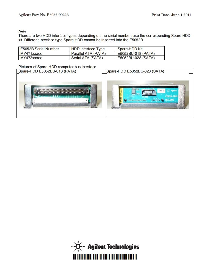 Agilent Part No.E5052-90223Print Date:June 1 2011Agilent E5052BU Option 028Hard Disk Drive Kit User's GuideE5052BU Option 028 refers to Spare HDD for the E5052B which serial-number prefix isMY472 or aboveInstallation requirement5188-4426 Key for Hard Disk CarrierUSB Pen Drive (Over 512MB)E5052B which serial-number prefix is MY472 or aboveE5052BU-028 Spare-HDD with SATA interface.ProcedureIf you swap your Spare HDD(Hard Disk Drive)with the mounted HDD in the E5052B,you need toupdate Syscal data and Limit files.For details,follow the procedure in E5052B Online Help(http://ssa.tm.agilent.com/e5052b/manuals/webhelp/eng)Home Product Information Maintenance Removing/Mounting Removable Hard DiskStep 1.Saving system calibration data from removable hard disk to USB pen driveStep 2.Removing Removable Hard DiskStep 3.Mounting Removable Hard DiskNote:Since this is the first time boot up for the Spare Removable Hard Disk,the InitialRegistration is required.For details,follow the procedure in E5052B Installation Guide(http://www.agilent.com/find/e5052b-manual)Step 4.Recalling System Calibration Data from USB Pen drive to Removable Hard DiskES0528 Hale▣回☒Dornoi tdms Sah GougRemoving/Mounting Removable HardDisk。lker caltetco‘器aan的mm些k恤g●atrement UsingE5053 A and Femal M红·Removing Removable Hard Disk¥◆Gock-imer Measunment¥◆Data Analysis and Cata0pt.Mouating Remecable Hard Diskr◆SgC0 ntrol FunctionsOther topcs about Malntenance卡◆6rey灵手◆Treubleshootng9山MangSaving system calibration data from removablehard disk to USB pen driveAgilent Technologies