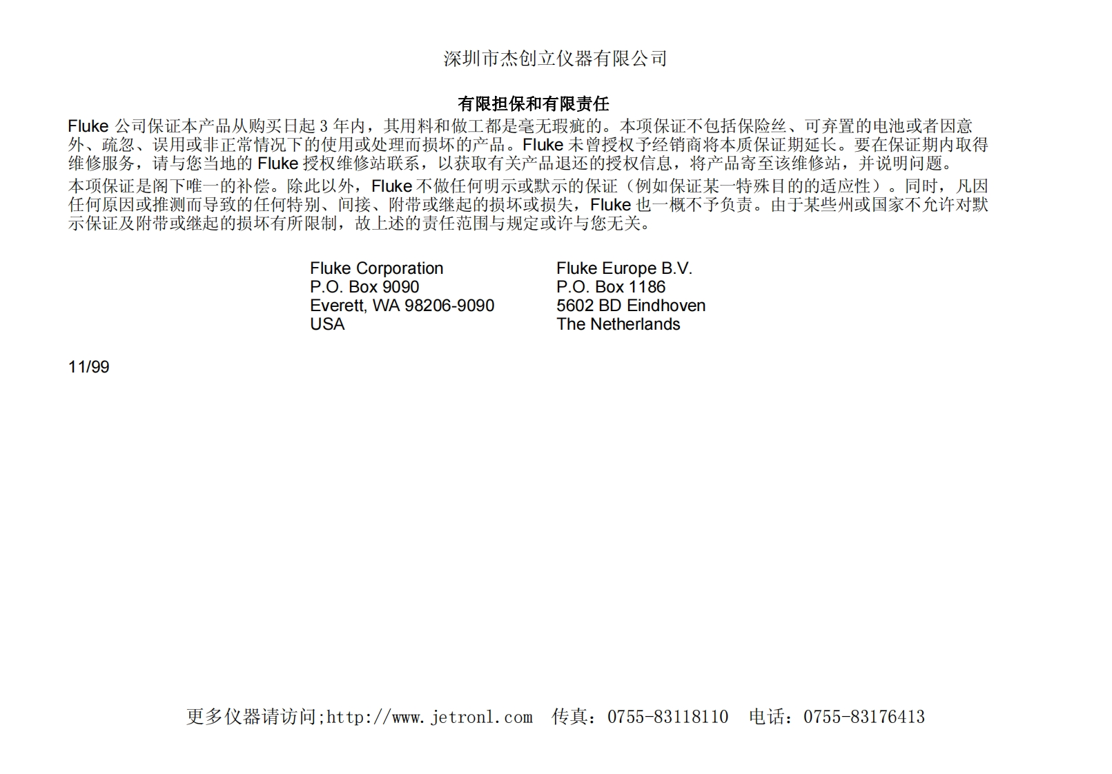 。789ProcessMeter用户手册深圳市杰创立仪器有限公司August 2002 Rev.2,11/09(Simplified Chinese)2002-2009 Fluke Corporation,All rights reserved.Specifications are subject to change without notice.All product names are trademarks of their respective companies.更多仪器请访问;http:/ww.jetronl.com传真:0755-83118110电话:0755-83176413