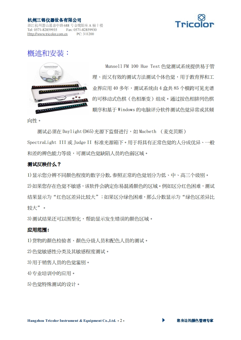 杭州三鲍仪器设备有限公司浙江杭州萧山通惠中路688号金鹭银座A幢十楼TricolorTe:0571-82859935Fax:0571-82859930Http://www.tricolor.com.cn PC:311200FM1O0 Hue Test色觉测试系统简易操作手冊mashine cor:g了杭州三锦仪器设备有限公司Version 1.02008年11月18日Hangzhou Tricolor Instrument Equipment Co.,Ltd.-1-您身边的颜色管理专家